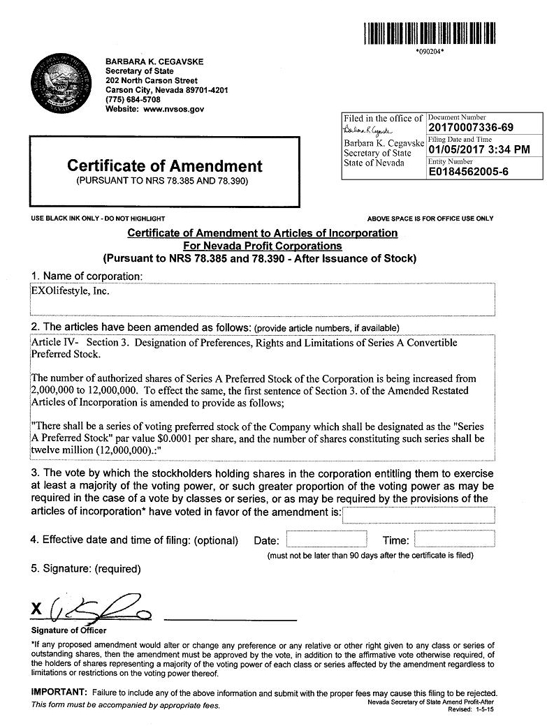 3.1 | Certificate of Amendment to Articles of Incorporation, as filed with the Secretary of State of Nevada on January 5, 2017. | |