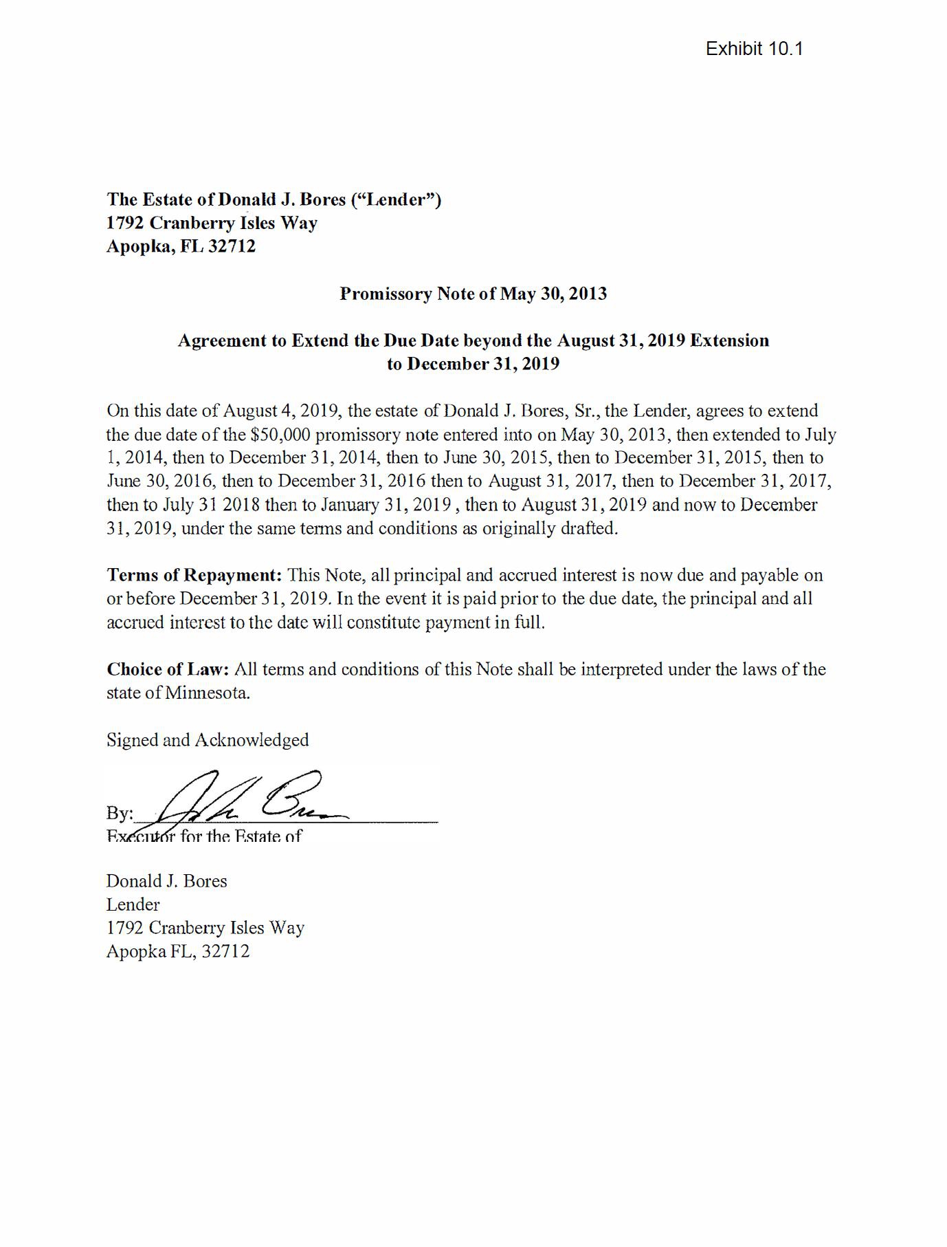On August 7, 2019 we entered into an Amendment with the Estate of Donald J. Bores, Sr. to extend the maturity date of the promissory note in the principal amount of $50,000 originally issued to Mr. Bores from August 31, 2019 to December 31, 2019.