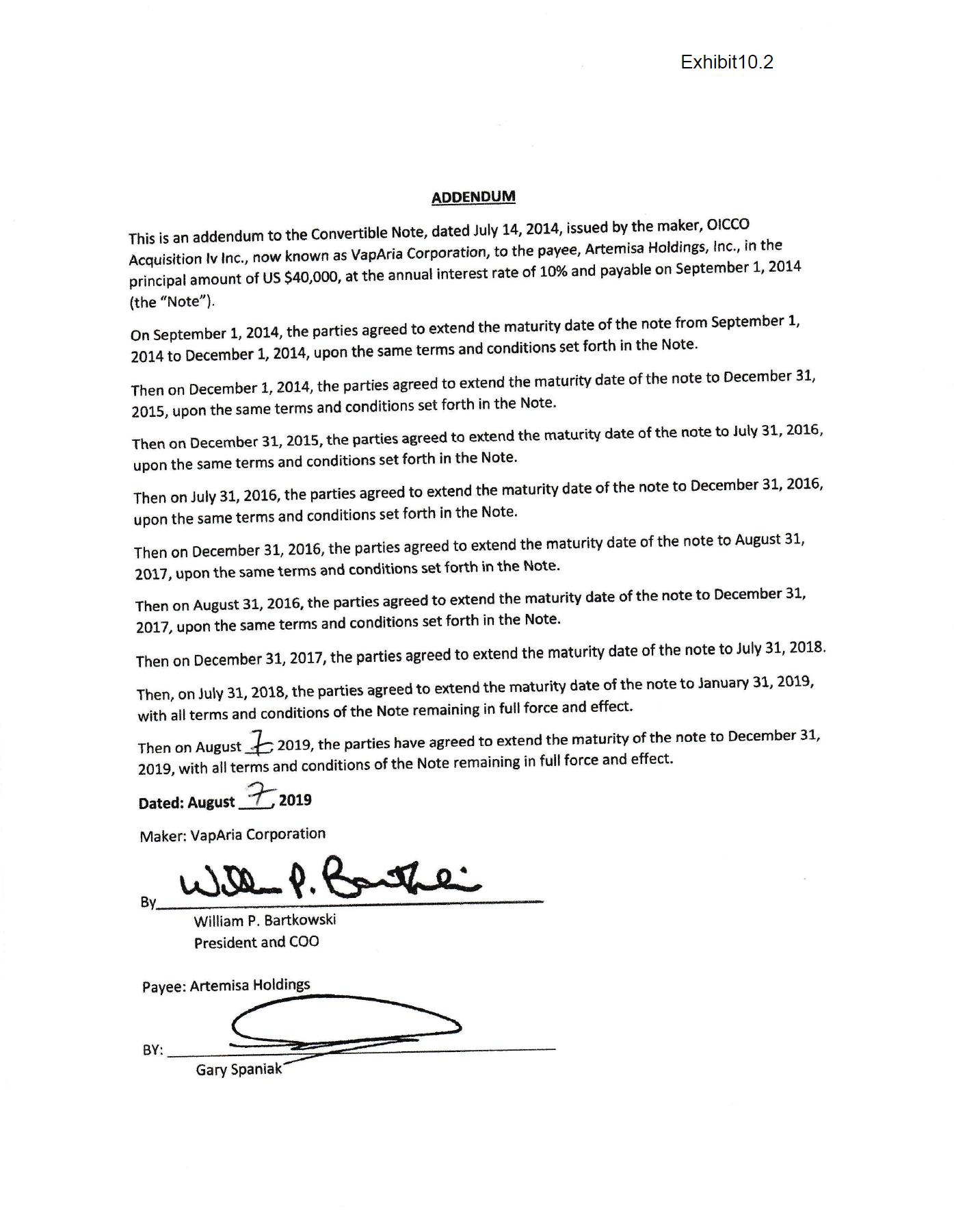 On August 7, 2019 we also entered into an Amendment with Artemisa Holdings, Inc. to extend the maturity date of the convertible note in the principal amount of $40,000 from August 31, 2019 to December 31, 2019.