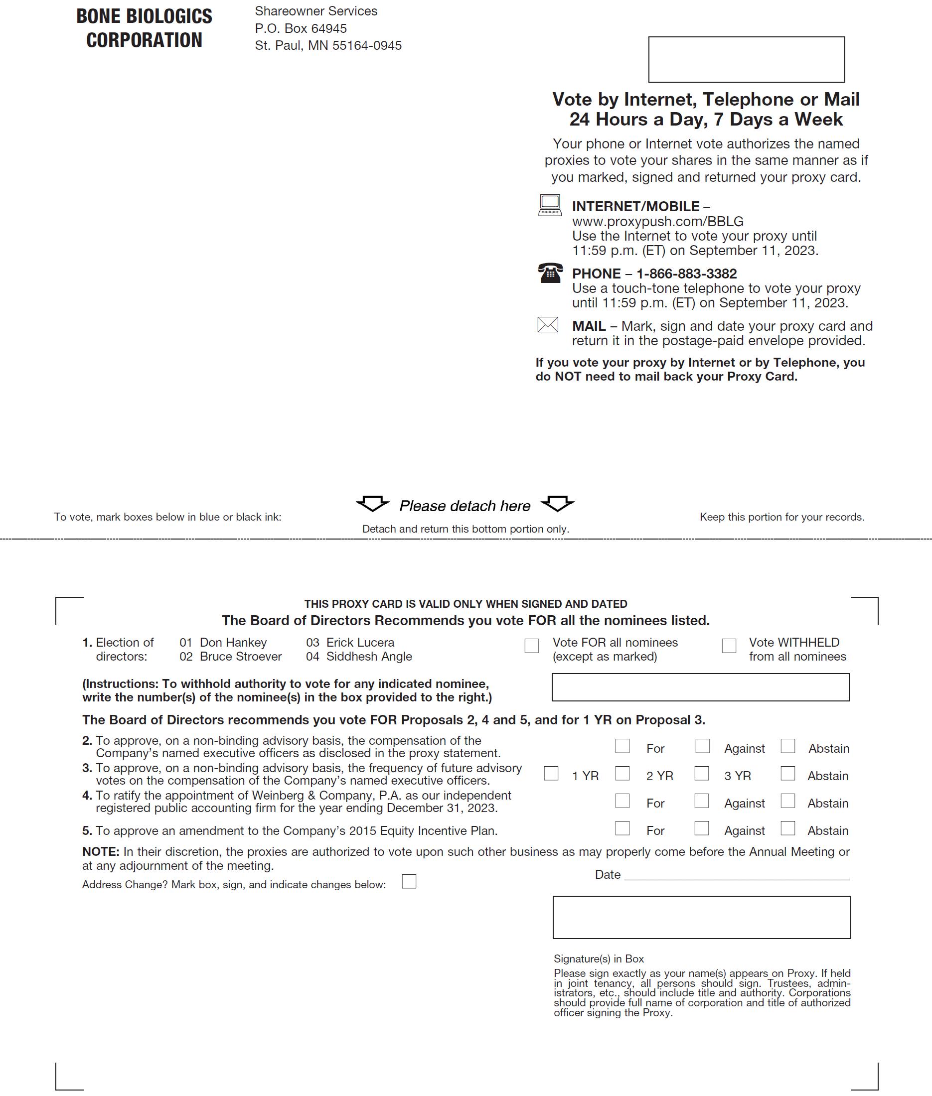 The proxy statement, proxy card and 2022 Annual Report to stockholders for the fiscal year ended December 31, 2022 are available at the following website: www.bonebiologics.com/investor-relation. These documents are also available to any stockholder who wishes to receive a paper copy by calling 866-870-3684, visiting www.investorelections.com/BBLG or emailing paper@investorelections.com.