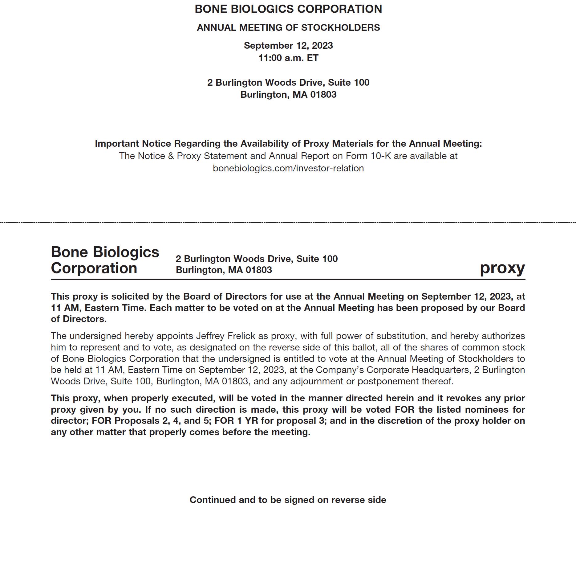 You are cordially invited to attend the 2023 Annual Meeting of Stockholders of Bone Biologics Corporation to be held at 11:00 a.m. Eastern time on Tuesday, September 12, 2023 at Bone Biologics Corporation offices, 2 Burlington Woods Drive, Ste 100, Burlington, MA 01803. Stockholders may also listen to the Annual Meeting via telephone at 520-525-8845.