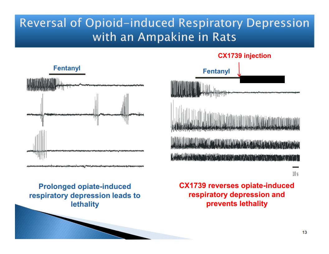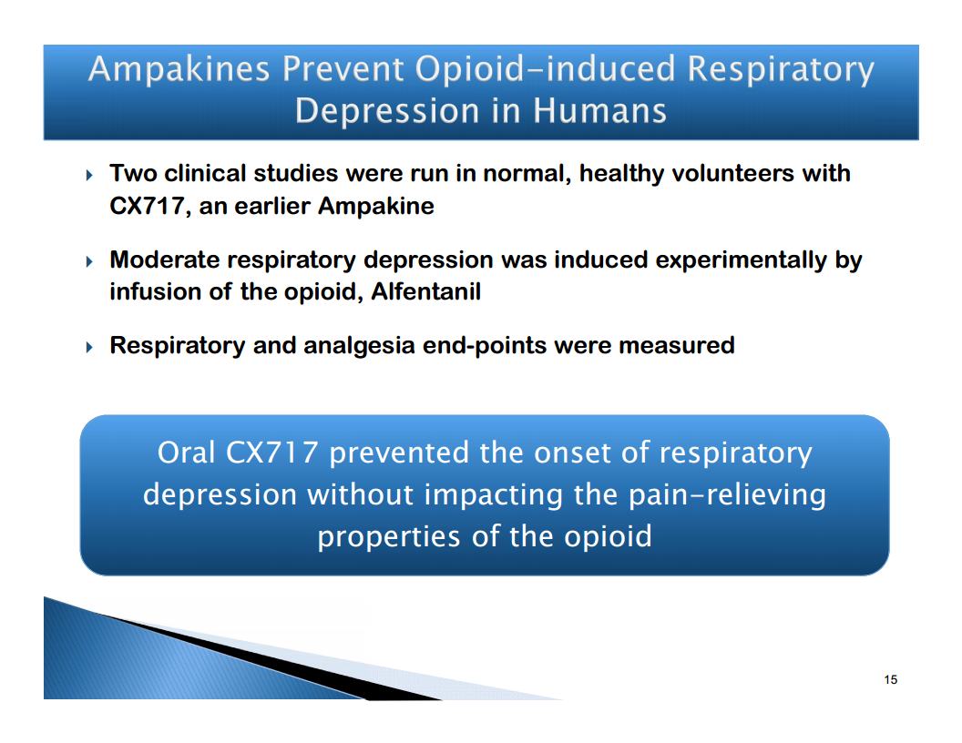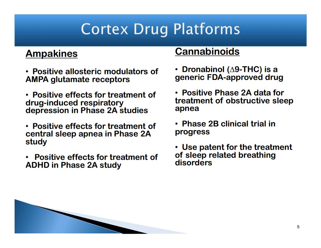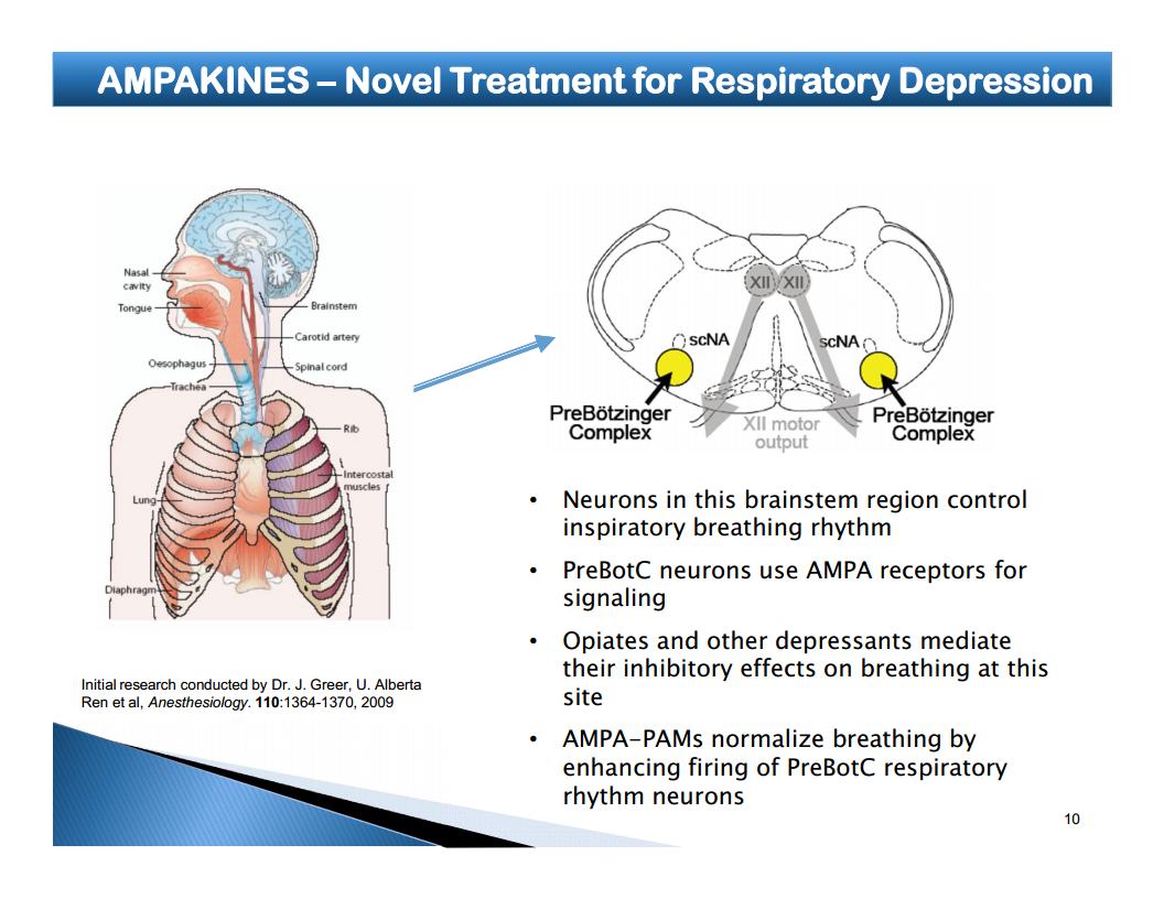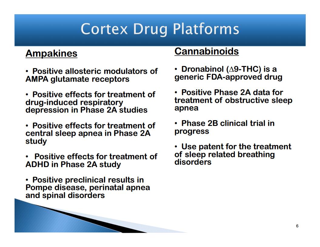 The first platform is a class of compounds known as ampakines that act as positive allosteric modulators of AMPA glutamate receptors. Several ampakines in both oral and injectable form are being developed by Cortex for the treatment of drug induced respiratory depression caused by opiates and anesthetics. In preclinical and clinical studies, such drugs have shown preliminary efficacy in central sleep apnea and restored normal respiration without altering the analgesic effects of opiates or the anesthetic effects of drugs such as propofol. The Company’s compounds belong to a new generation of ampakines that do not display the undesirable side effects displayed by previous compounds.