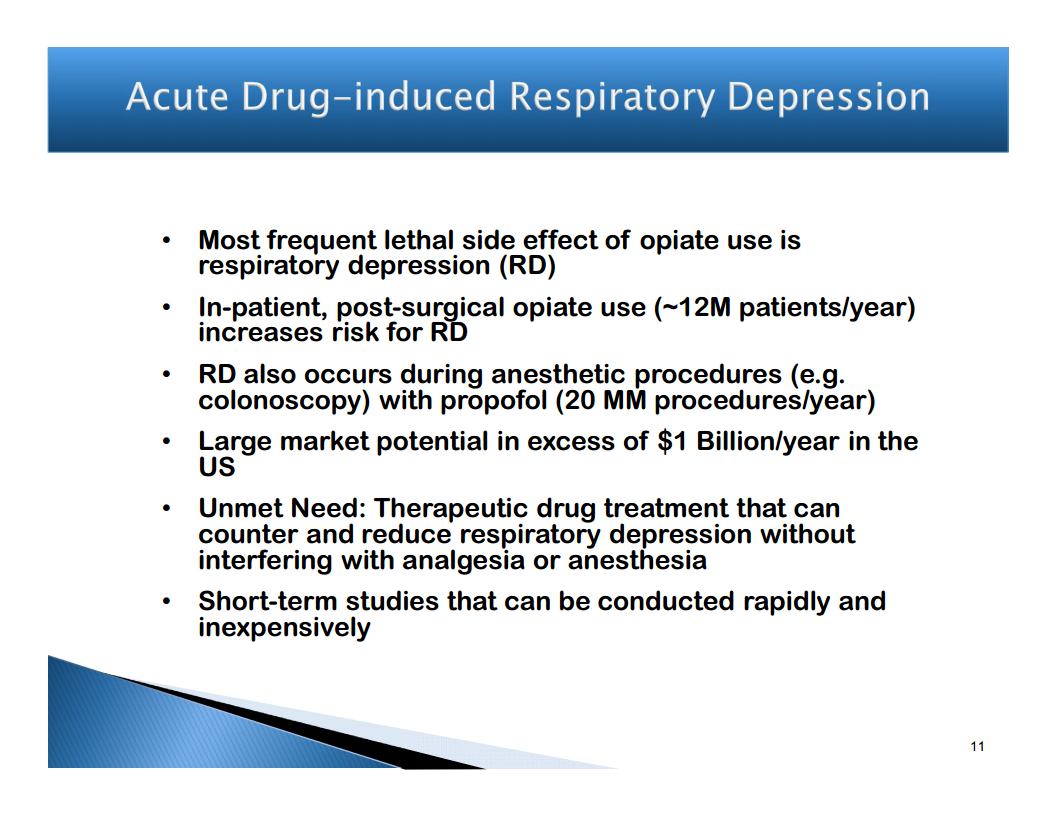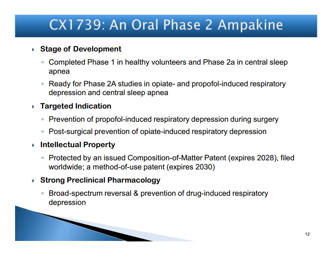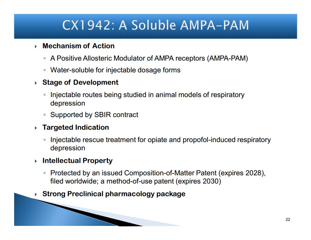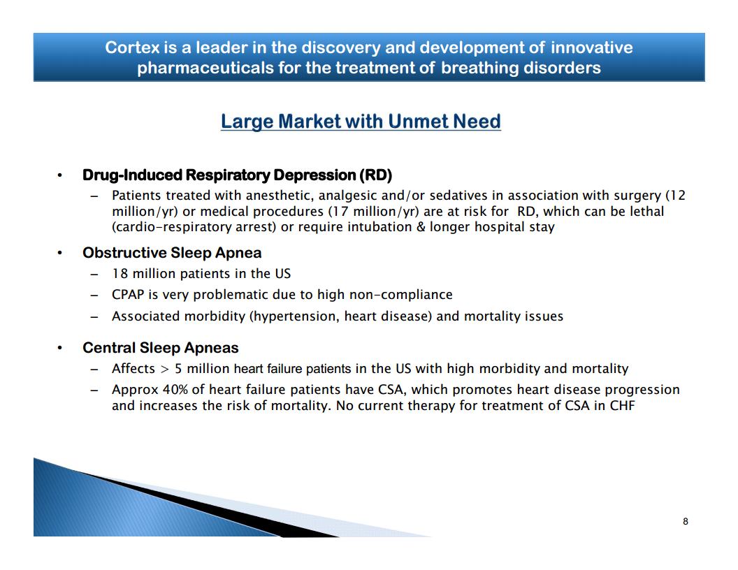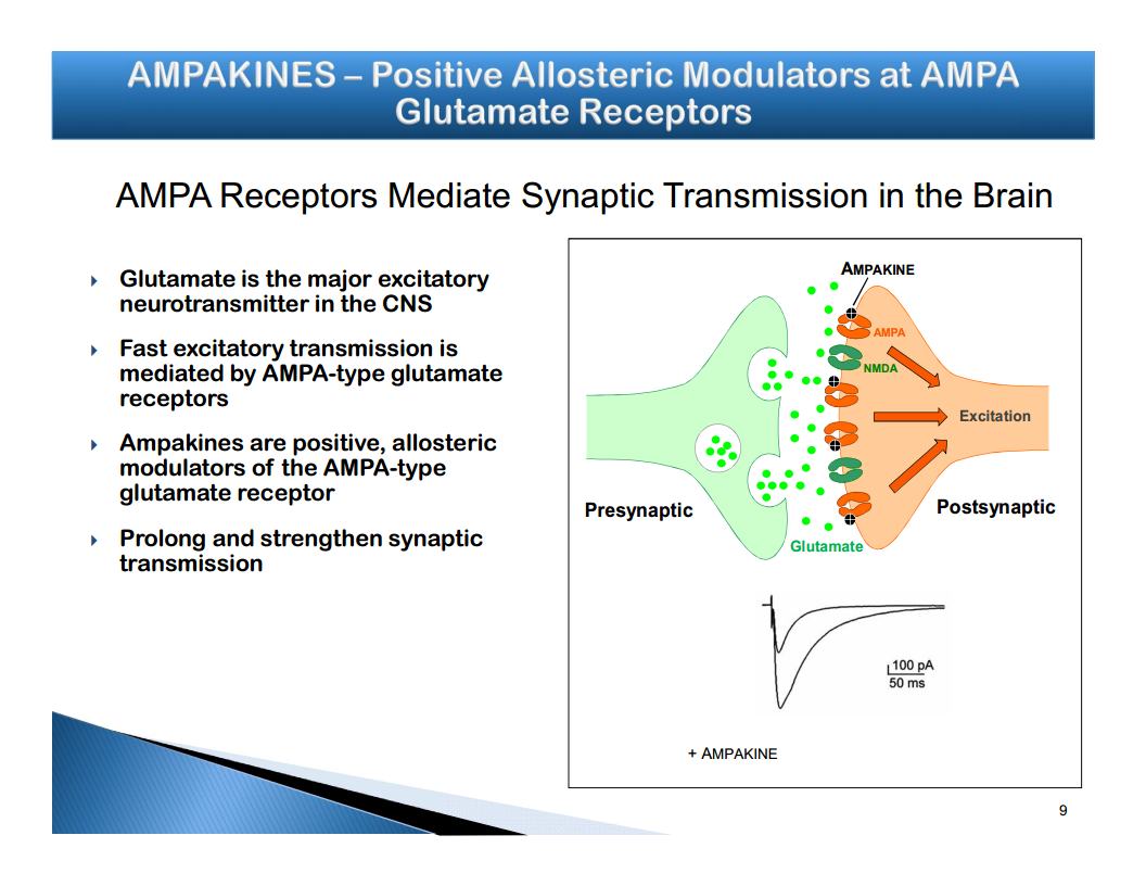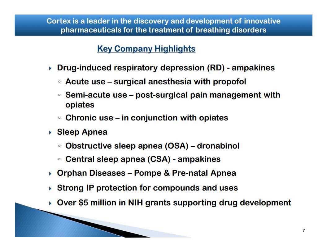 The first platform is a class of compounds known as ampakines that act as positive allosteric modulators of AMPA glutamate receptors. Several ampakines in both oral and injectable form are being developed by Cortex for the treatment of drug induced respiratory depression caused by opiates and anesthetics. In preclinical and clinical studies, such drugs have shown preliminary efficacy in central sleep apnea and restored normal respiration without altering the analgesic effects of opiates or the anesthetic effects of drugs such as propofol. The Company’s compounds belong to a new generation of ampakines that do not display the undesirable side effects displayed by previous compounds.