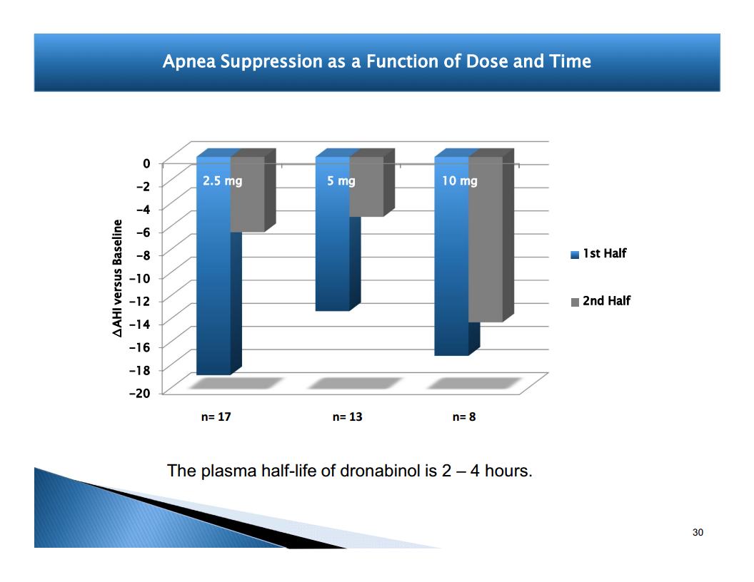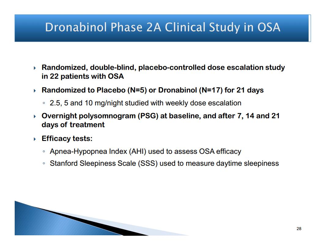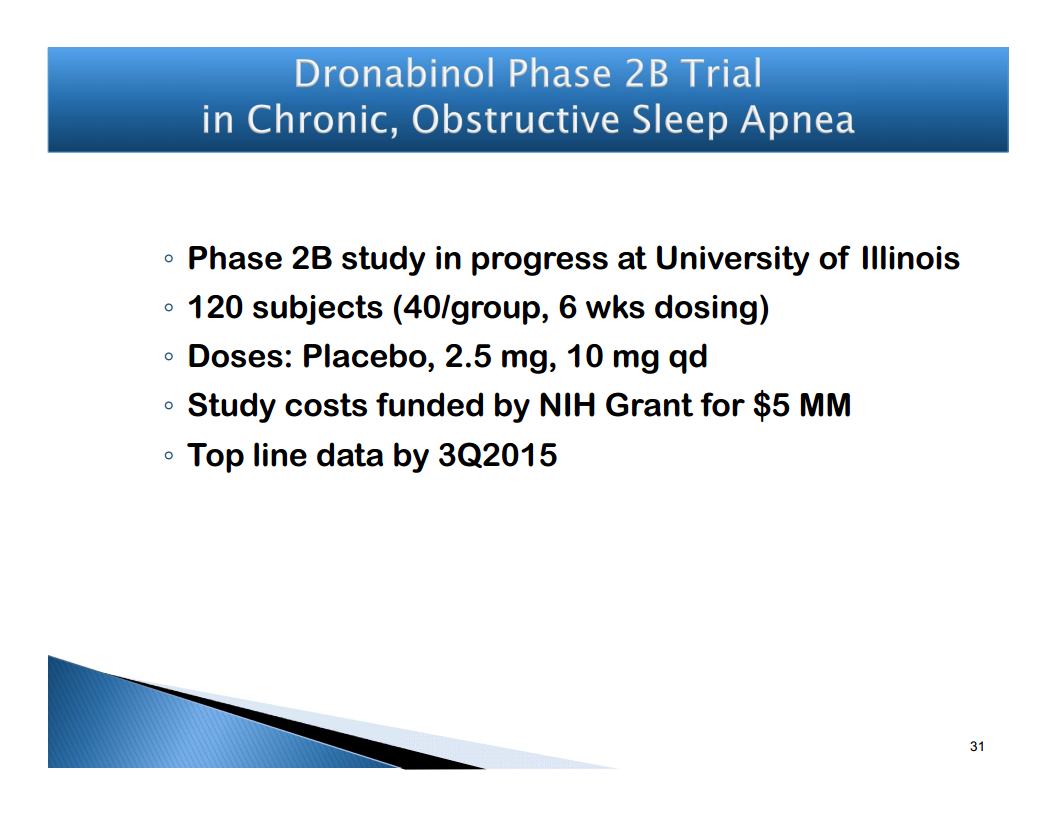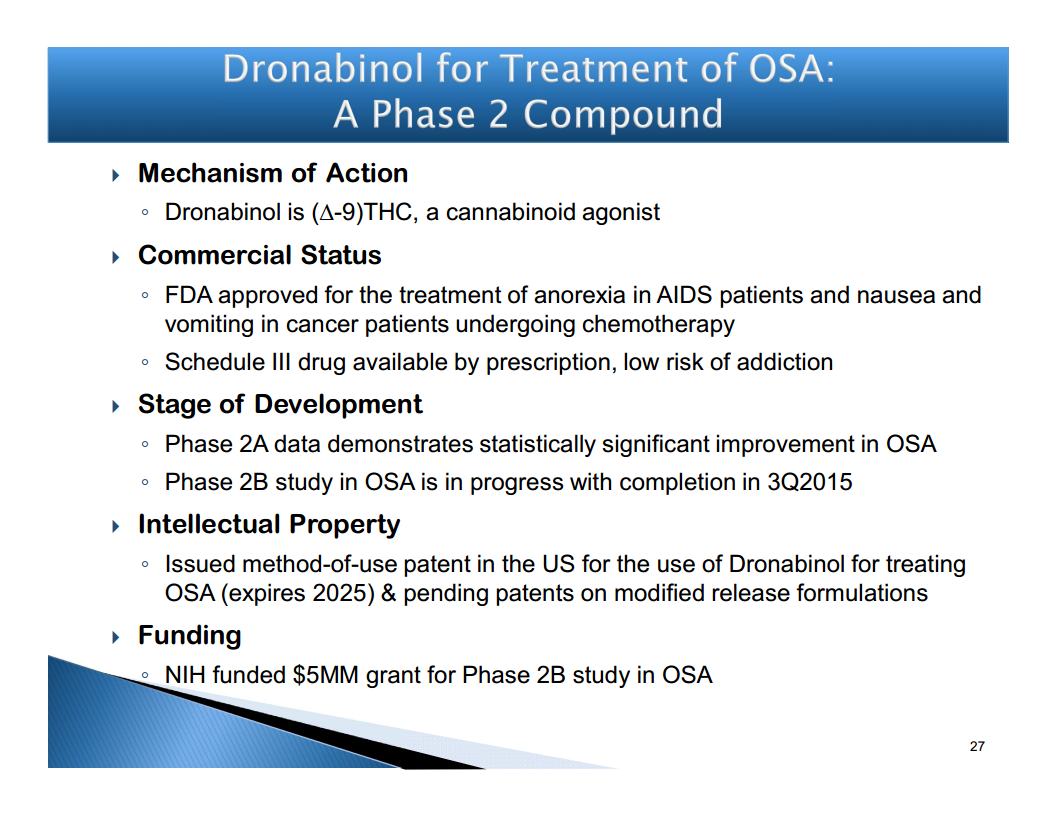 The second platform is the class of compounds known as cannabinoids, in particular, dronabinol. In a double-blind, placebo-controlled, dose-ascending Phase 2A clinical study conducted by the Company, dronabinol significantly improved measures of sleep apnea in a group of patients with obstructive sleep apnea. A larger 120 patient, double-blind, placebo-controlled Phase 2B study is currently being conducted by the University of Illinois and is being funded by the National Institutes of Health.