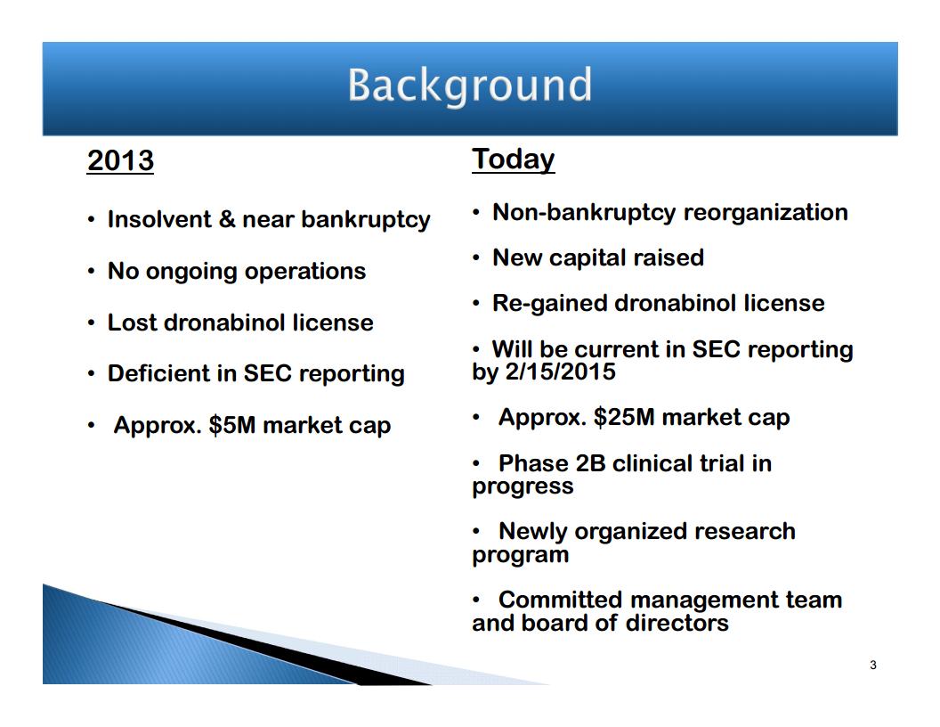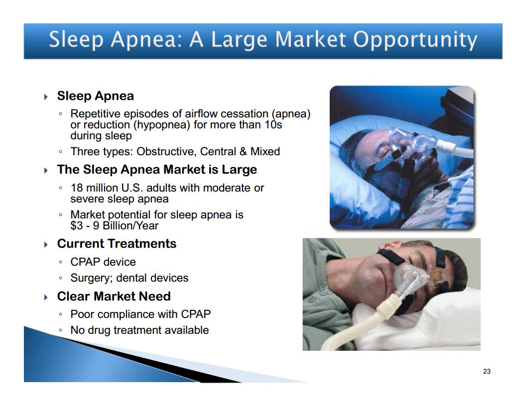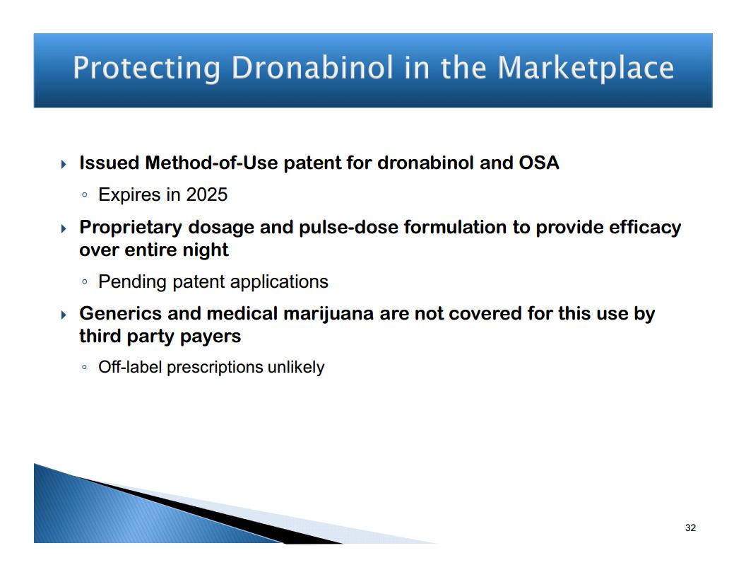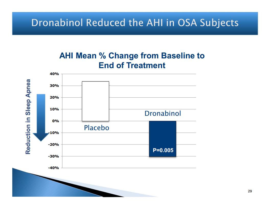 The second platform is the class of compounds known as cannabinoids, in particular, dronabinol. In a double-blind, placebo-controlled, dose-ascending Phase 2A clinical study conducted by the Company, dronabinol significantly improved measures of sleep apnea in a group of patients with obstructive sleep apnea. A larger 120 patient, double-blind, placebo-controlled Phase 2B study is currently being conducted by the University of Illinois and is being funded by the National Institutes of Health.
