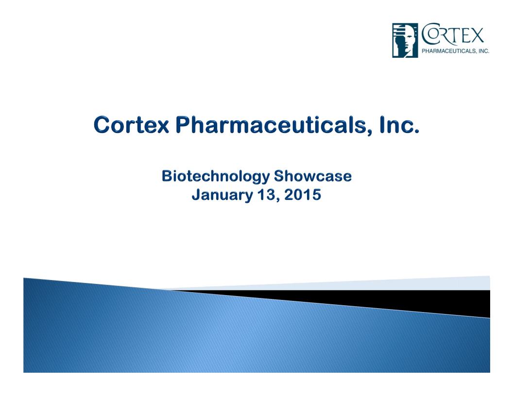 Glen Rock, N.J., Jan. 9, 2015/Globe Newswire – Cortex Pharmaceuticals, Inc. (CORX) (“Cortex” or the “Company”), a leader in developing drugs for respiratory disorders, particularly sleep apneas and drug-induced respiratory depression, announces that it will be presenting at Biotech Showcase 2015™ (www.ebdgroup.com/bts/index.php). The conference is co-sponsored by the EBD Group and Demy-Colton Life Sciences Advisors and will be held at the Parc 55 Wyndham San Francisco-Union Square Hotel in San Francisco, California from January 12 – 15, 2015.