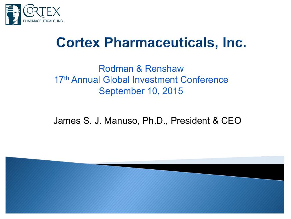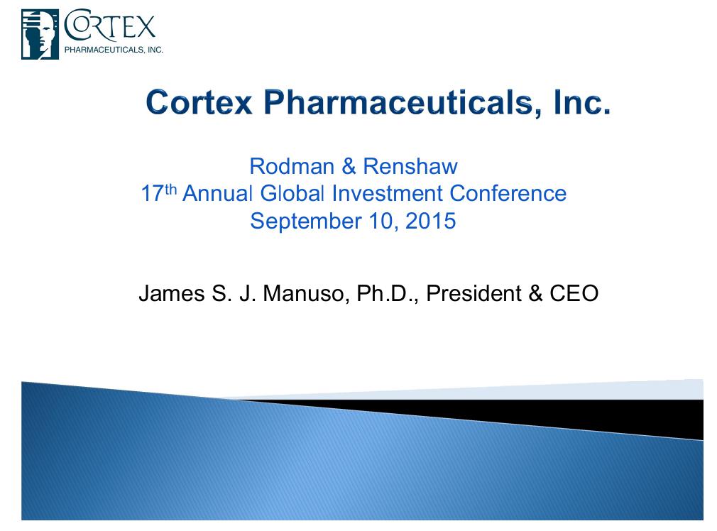 Glen Rock, N.J., September 8, 2015/Globe Newswire - Cortex Pharmaceuticals, Inc. (OTC: CORX) (“Cortex” or the “Company”), a leader in developing drugs for respiratory disorders, particularly obstructive sleep and central apneas and drug-induced respiratory depression, announces that it will be presenting at the Rodman & Renshaw 17th Annual Global Investment Conference (www.rodm.com). The conference is being sponsored by H.C. Wainwright & Co. and is being held on September 8 – 10, 2015 at The St. Regis Hotel, New York, New York. The Company’s CEO, James S. J. Manuso, Ph.D. is currently scheduled to present at 4:40 p.m. Eastern Time on Thursday, September 10, 2015.