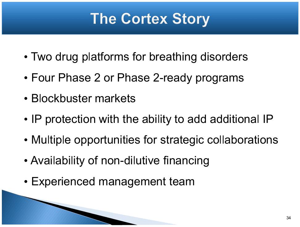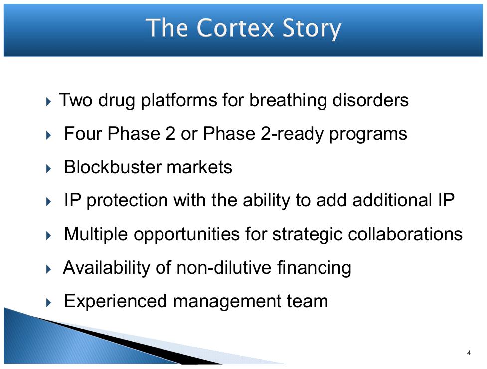 Cortex is a leader in developing drugs for respiratory disorders, particularly sleep apneas and drug-induced respiratory depression, and owns patents and patent applications for certain families of chemical compounds that claim the chemical structures and their use in the treatment of these and other disorders.