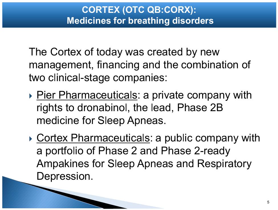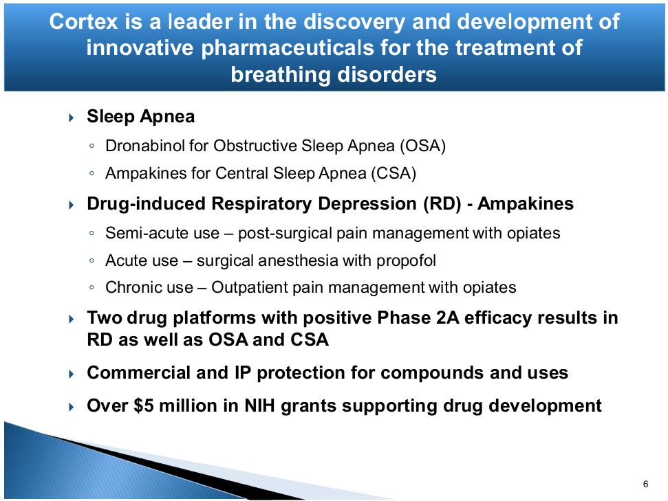 Dr. Manuso will present details of Cortex’s clinical initiatives with respect to dronabinol for obstructive sleep apnea (Phase 2B) and CX-1739 (oral) for central sleep apnea (Phase 2B) and opiate induced respiratory depression (Phase 2A), and also will provide additional program and background information.