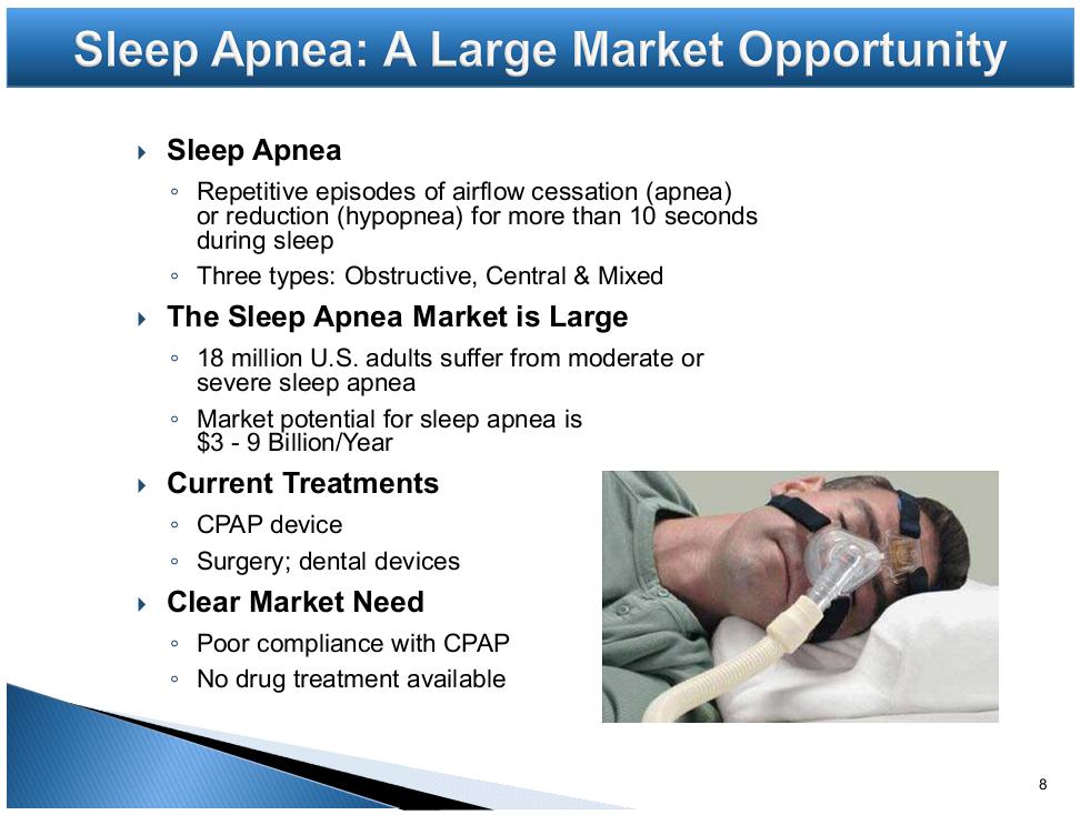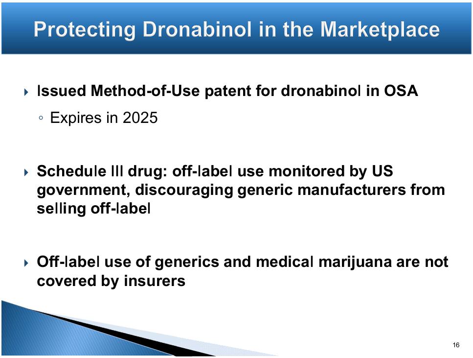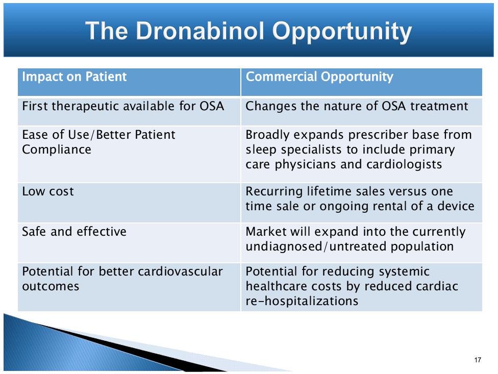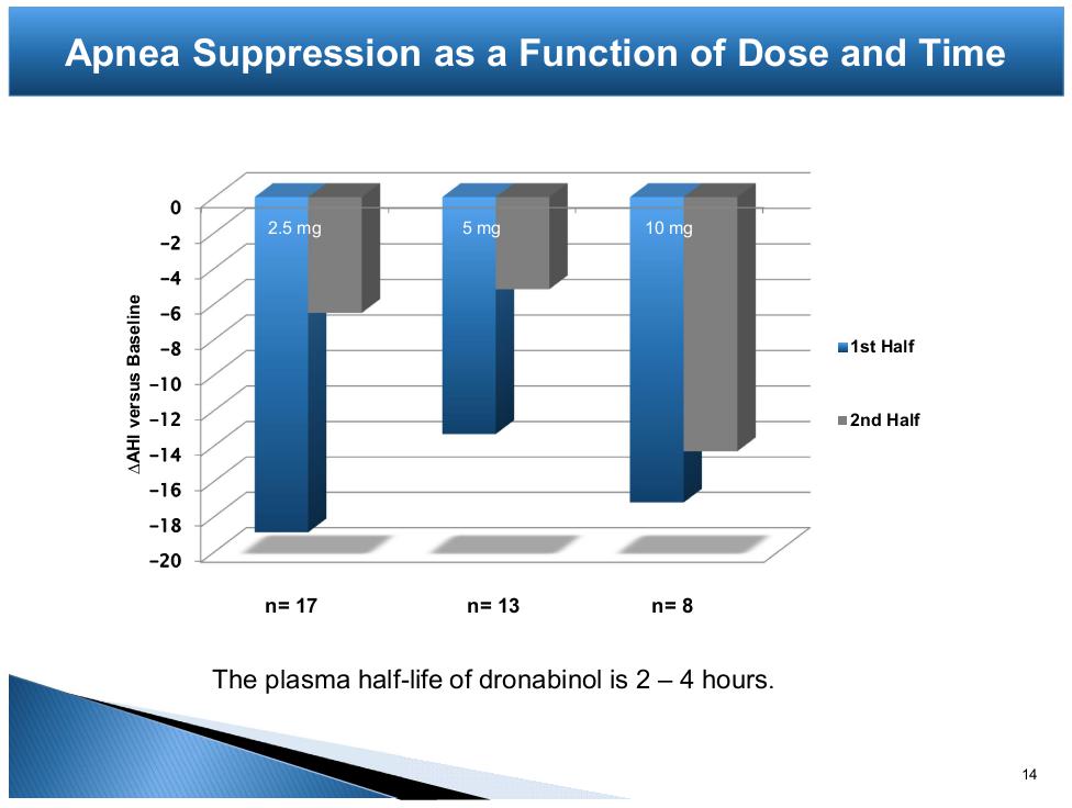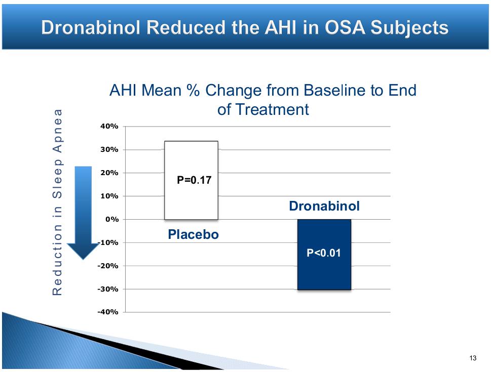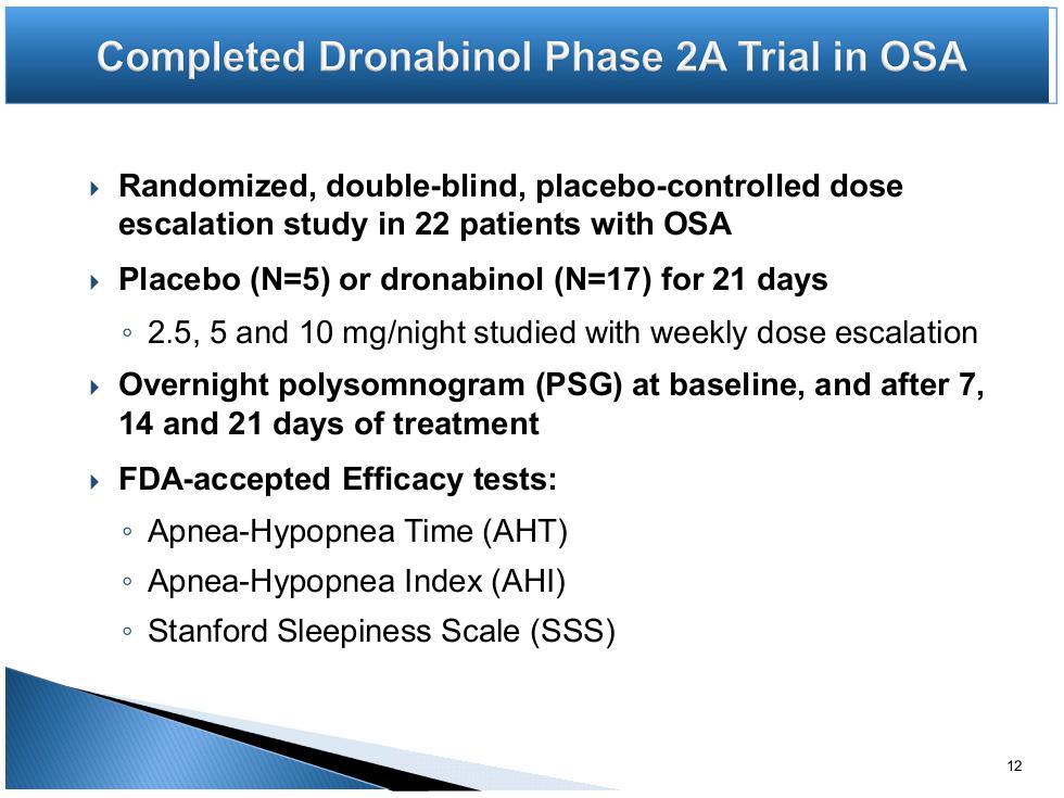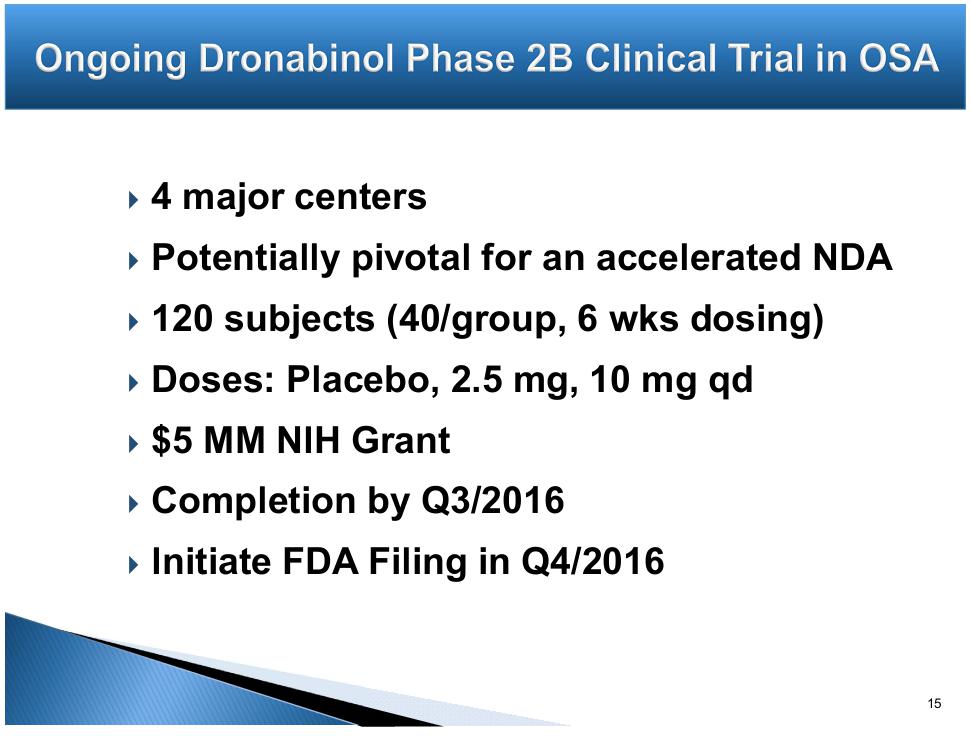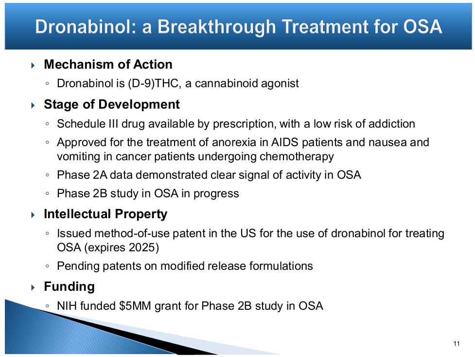 The first platform is the class of compounds known as cannabinoids, in particular, dronabinol. Under a license agreement with the University of Illinois, the Company has rights to patents claiming the use of cannabinoids for the treatment of sleep related breathing disorders. In a double-blind, placebo-controlled, dose-ascending Phase 2A clinical study conducted by the Company, dronabinol produced a statistically significant reduction in the Apnea-Hypopnea Index, the primary therapeutic end-point, and was observed to be safe and well tolerated in a group of patients with obstructive sleep apnea (OSA). The University of Illinois and three other centers currently are investigating dronabinol in a potentially pivotal, six week, 120 patient, double-blind, placebo-controlled Phase 2B clinical trial in patients with OSA. This study, which the University of Illinois expects to be completed during the second quarter of 2016, is fully funded by the National Heart, Lung and Blood Institute of the National Institutes of Health. The Company is not involved in the management or funding of this ongoing clinical trial.
