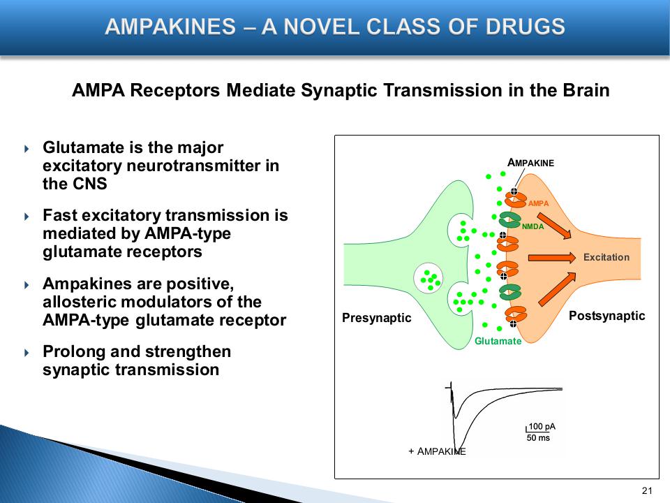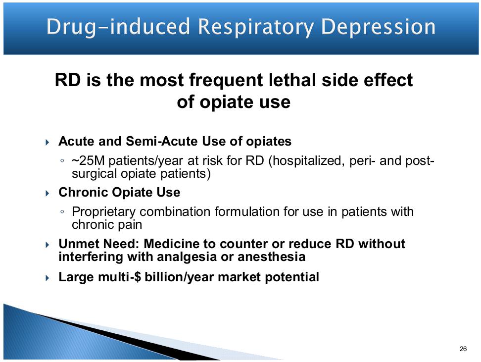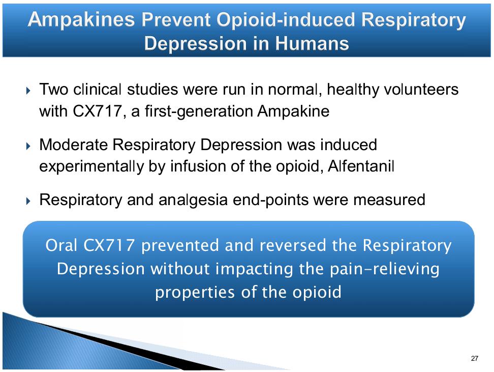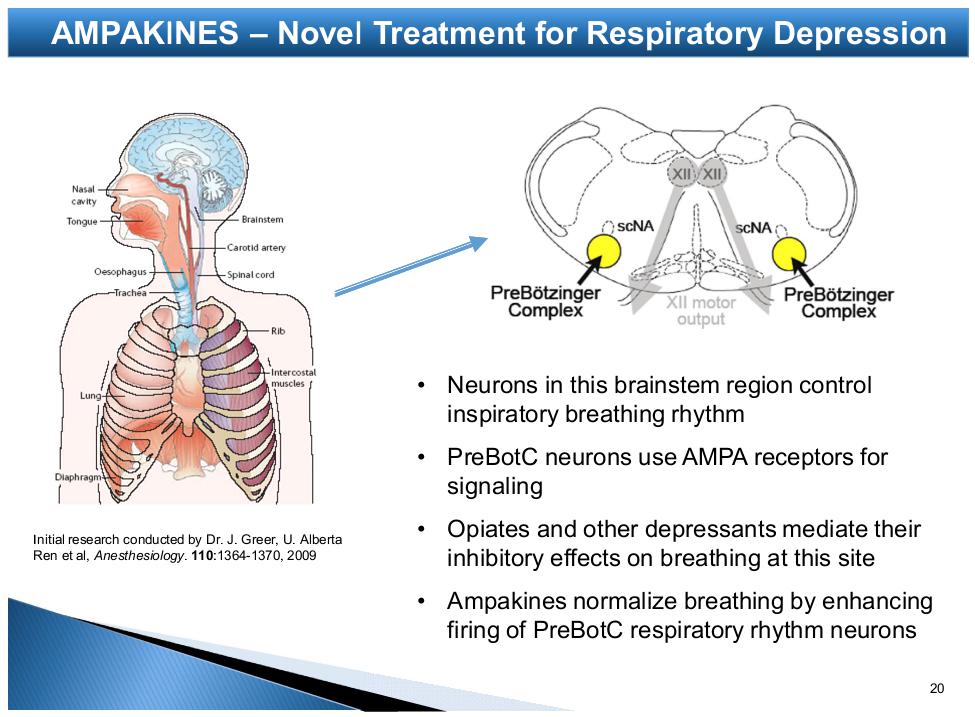 The second platform is a class of proprietary compounds known as ampakines that act to enhance the actions of the excitatory neurotransmitter glutamate at AMPA glutamate receptors. Several ampakines in both oral and injectable form are being developed by Cortex for the treatment of a variety of breathing disorders. In clinical studies, such drugs have shown preliminary efficacy in central sleep apnea and in antagonizing respiratory depression produced by opiates without altering their analgesic effects. Ampakines also have improved breathing in animal models of orphan disorders such as Pompé Disease, spinal cord damage and perinatal respiratory distress. The Company’s compounds belong to a new generation of ampakines that do not display the undesirable side effects displayed by earlier versions.