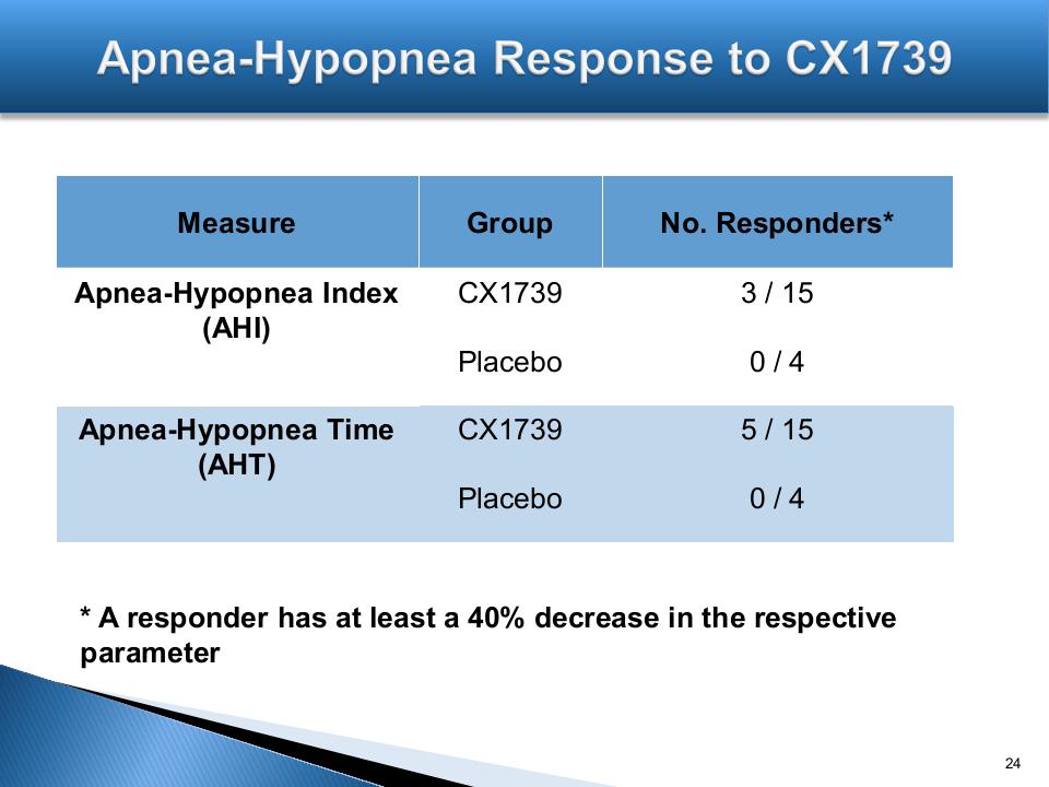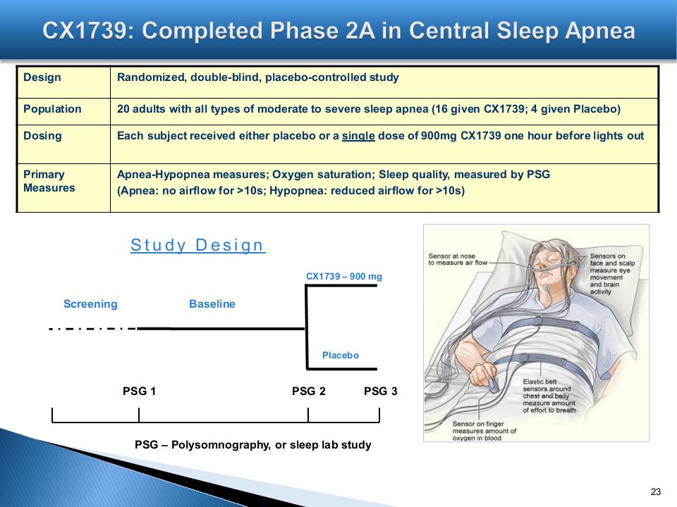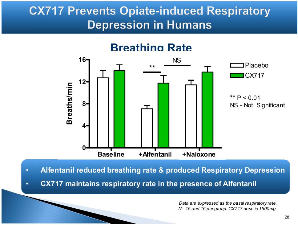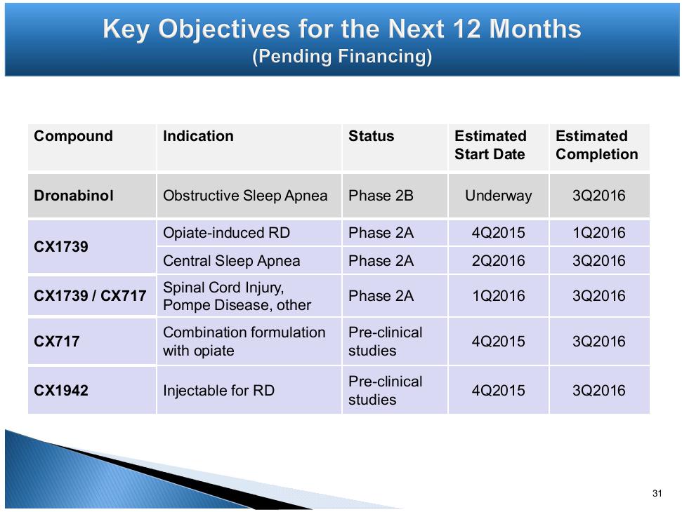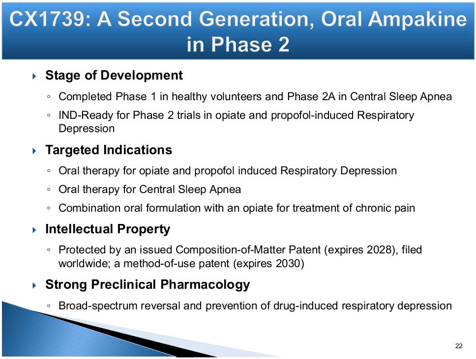 Dr. Manuso will present details of the Company’s clinical initiatives with respect to dronabinol for obstructive sleep apnea (Phase 2B) and CX-1739 (oral) for central sleep apnea (Phase 2B) and opiate induced respiratory depression (Phase 2A), and also will provide additional program and background information.