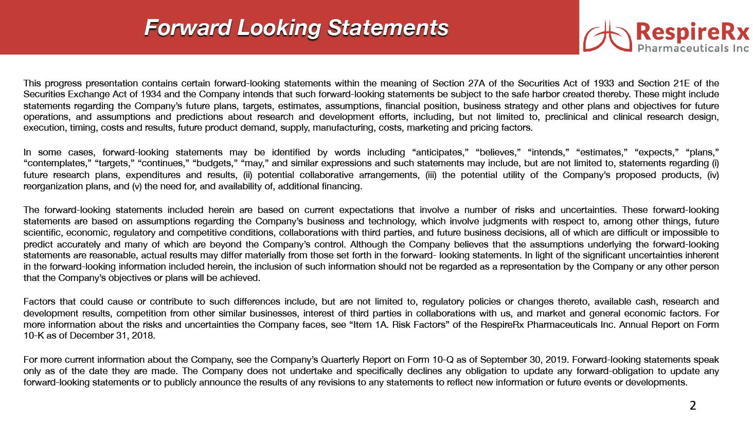 | 99.1 | RespireRx Pharmaceuticals Inc. Corporate Presentation |