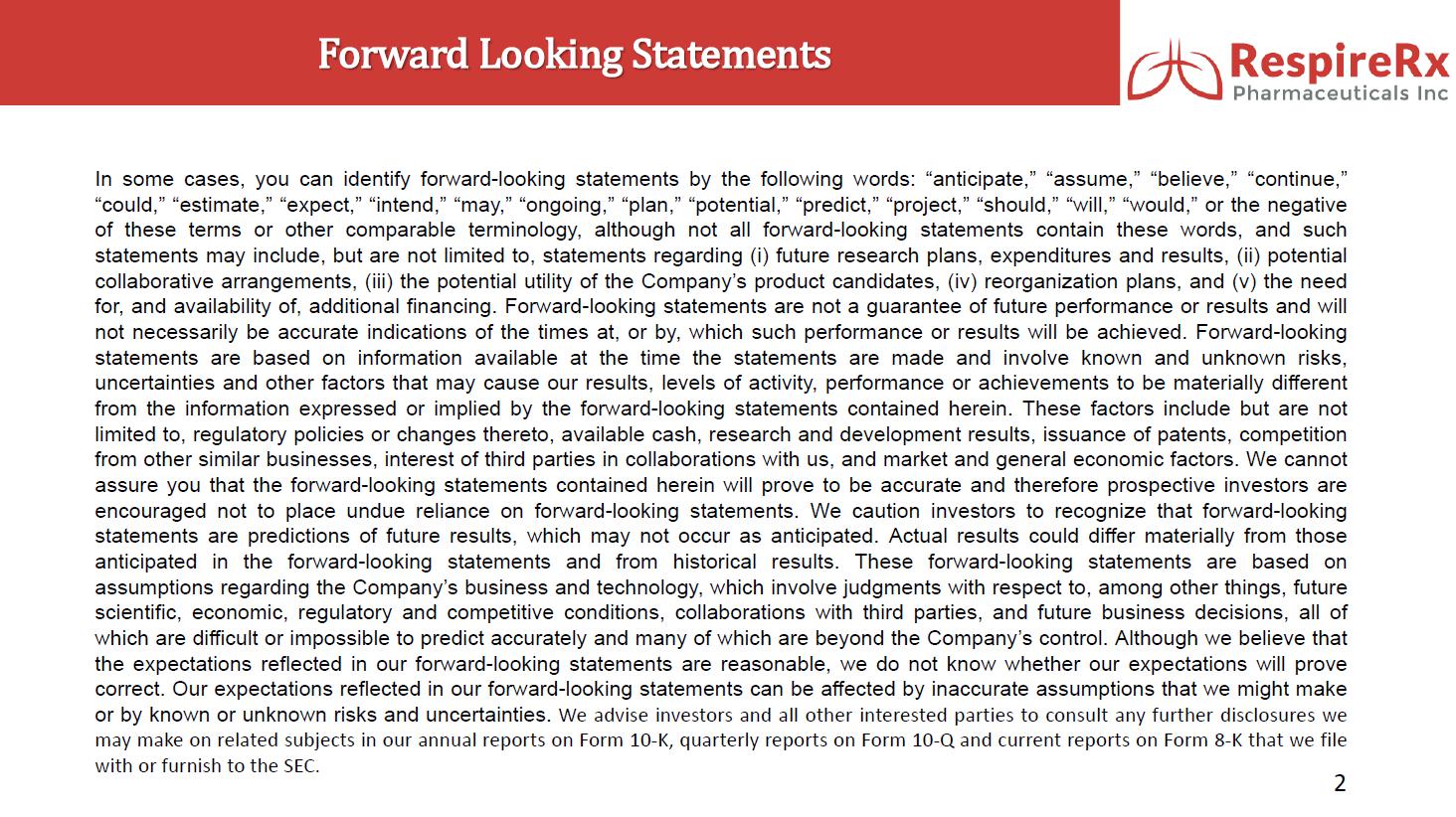 | 99.2 | RespireRx Pharmaceuticals Inc. Summary |