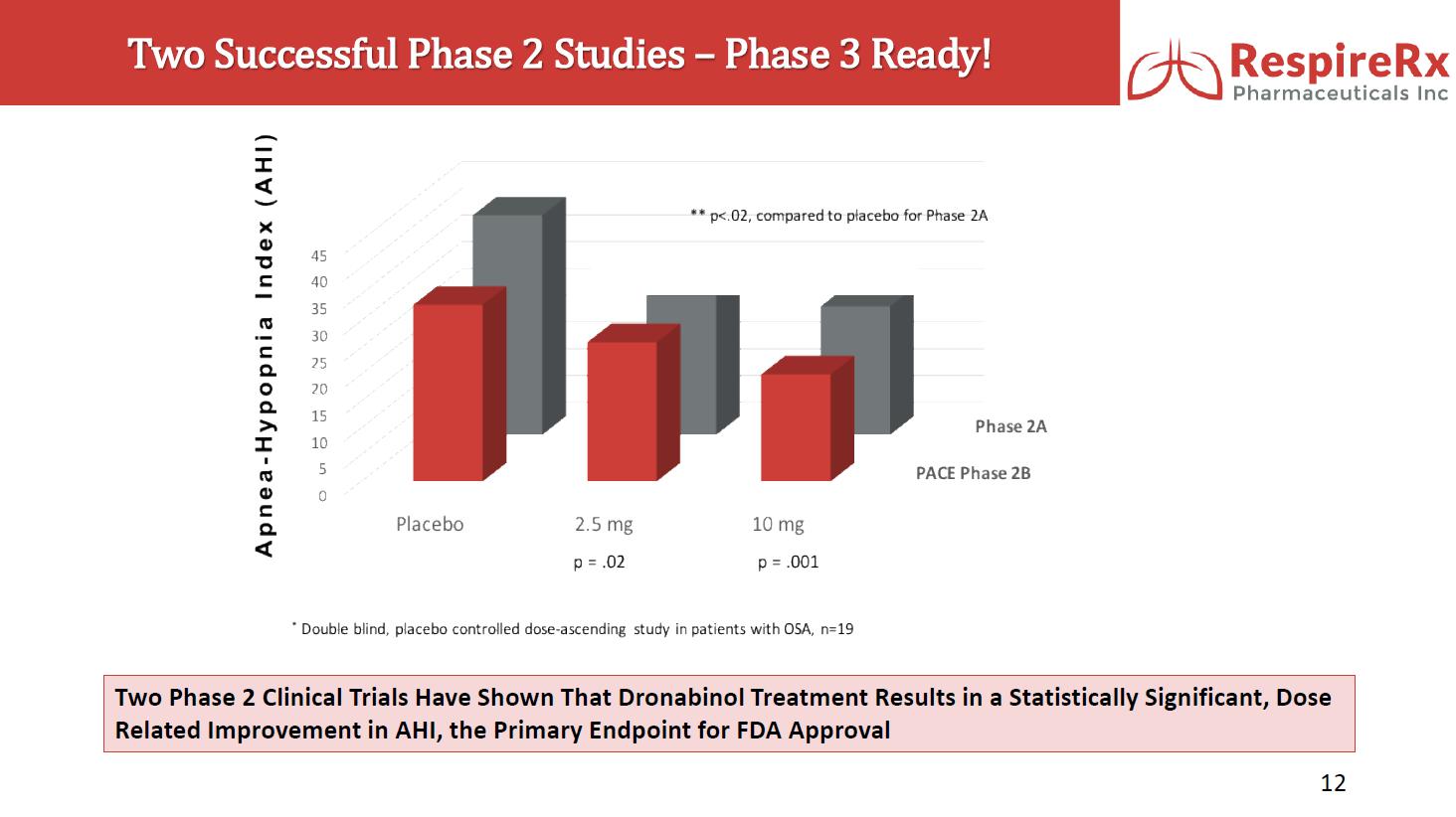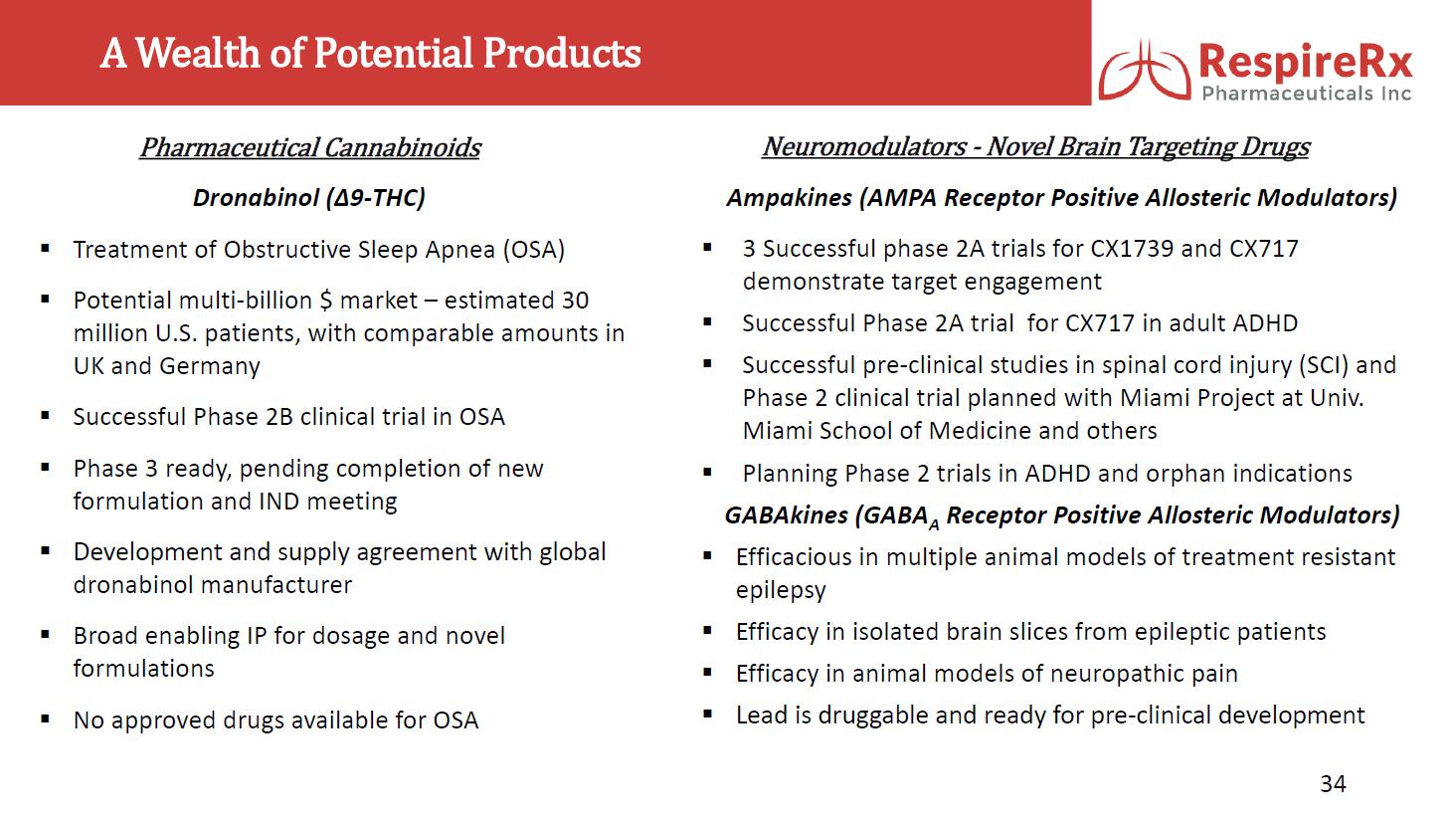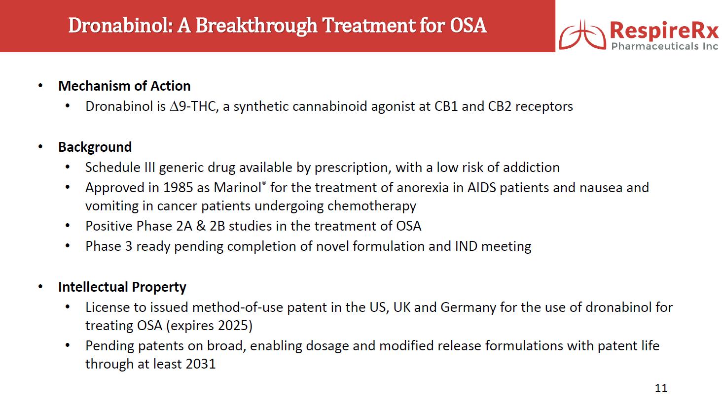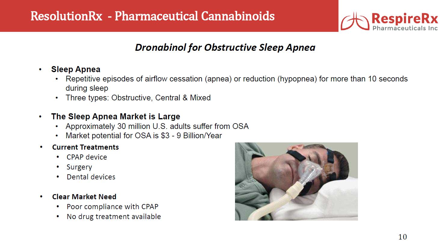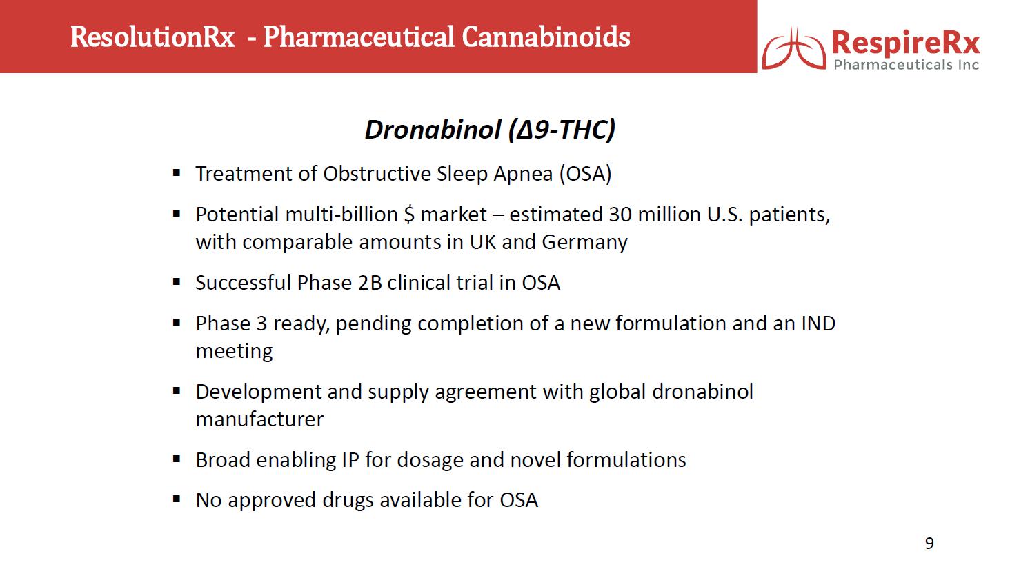 ResolutionRx – Two successful Phase 2 clinical trials have been completed demonstrating the ability of dronabinol to reduce the symptoms of OSA. The Company has designed and is developing proprietary, patent-pending dronabinol formulations that, if successful, could prove to be superior to existing formulations and not only extend market exclusivity for the treatment of OSA, but other indications as well.