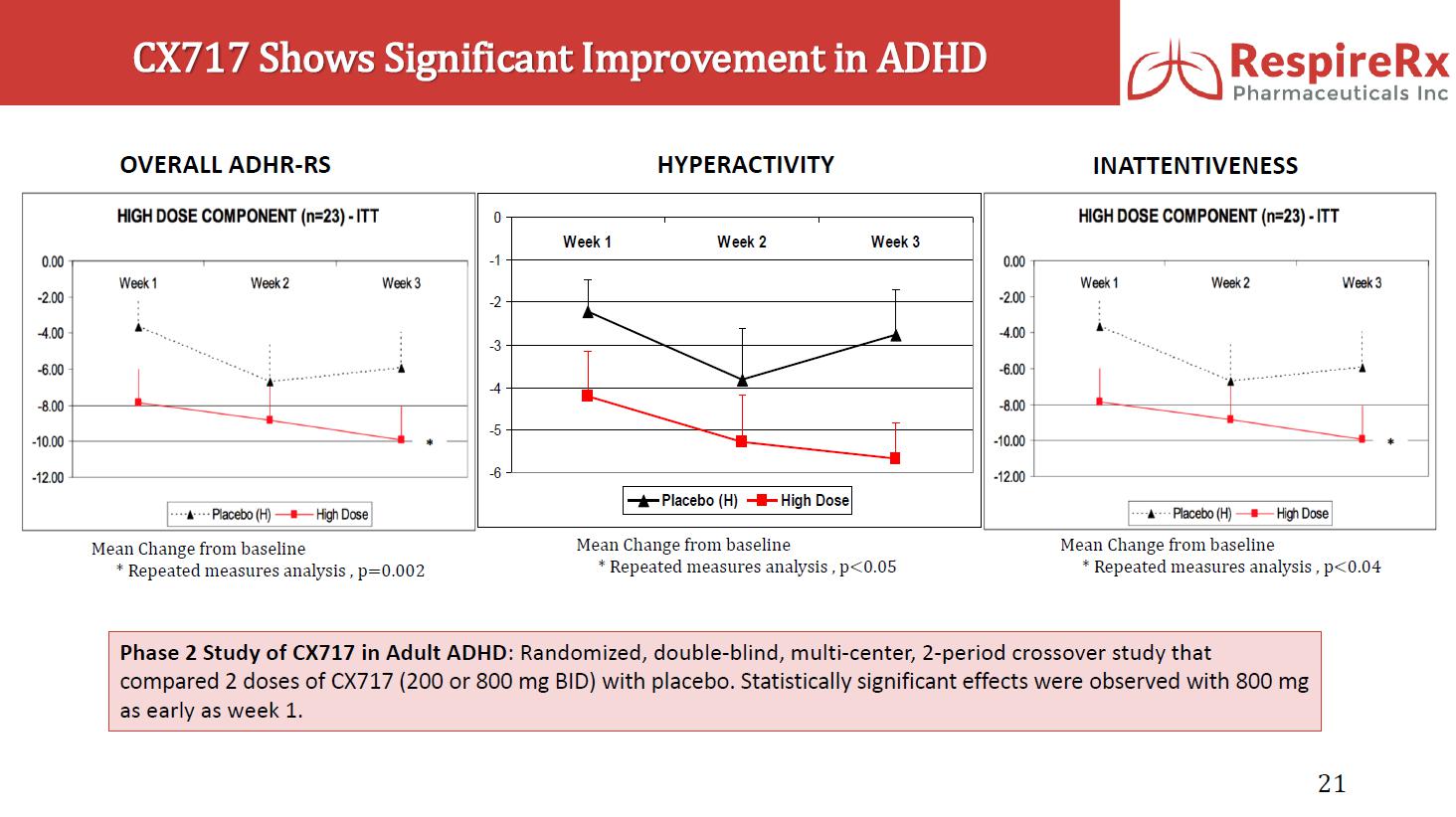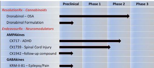 EndeavourRx - CX717 and CX1739, our lead clinical AMPAkines, have successfully completed multiple Phase 1 safety trials with no drug-associated serious adverse events. Both compounds have also completed Phase 2 efficacy trials demonstrating target engagement, by antagonizing the process of opioid-induced respiratory depression (“OIRD”). CX717 has successfully completed a Phase 2 trial demonstrating the ability to significantly reduce the symptoms of adult ADHD.