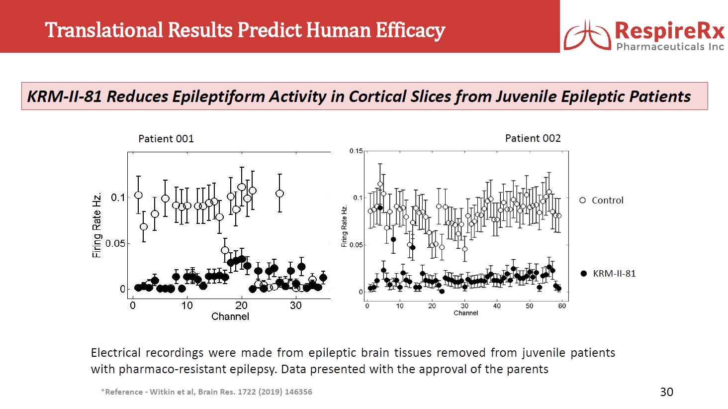 KRM-II-81, our lead GABAkine, has demonstrated highly desirable properties in animal models of drug resistant epilepsy and chronic pain, with greatly reduced liability to produce side effects associated with current treatments. The anticonvulsant action of KRM-II-81 was confirmed by microelectrode recordings from slices obtained from freshly excised cortex from epileptic patients.