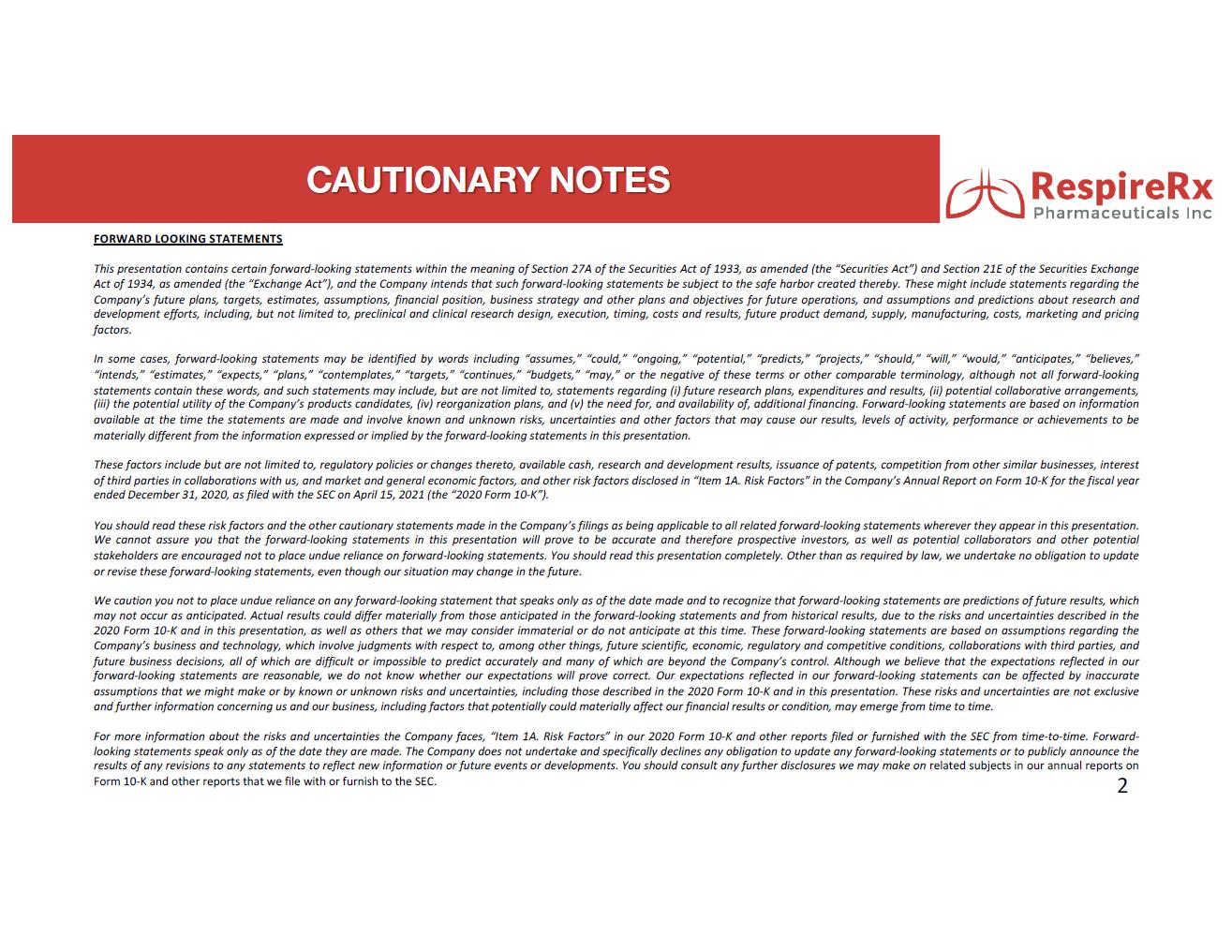 by registered participants. The slide deck, both in video and pdf format (without video), will be available on the Company’s website at www.respirerx.com and as a furnished (not filed) exhibit to our Current Report on Form 8-K available at www.sec.gov. Because the Company is participating in the virtual portion of the Biotech Showcase™ and the presentation has been pre-recorded, there is no set schedule for presenting companies.
