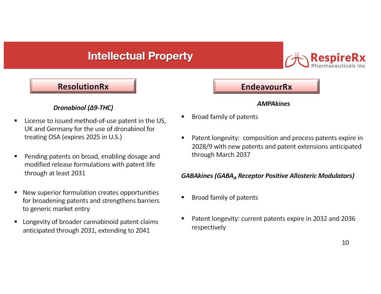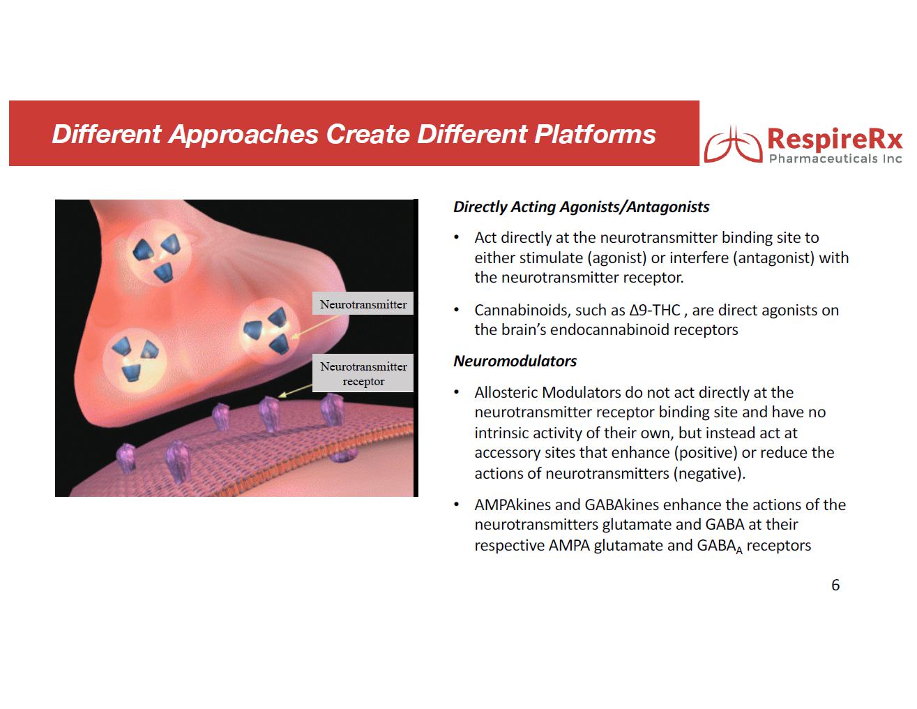 RespireRx Pharmaceuticals Inc. is a leader in the discovery and development of medicines for the treatment of psychiatric and neurological disorders, with a focus on treatment options that address conditions affecting millions of people, but for which there are few or poor treatment options, including obstructive sleep apnea (“OSA”), attention deficit hyperactivity disorder (“ADHD”), epilepsy, chronic pain and recovery from spinal cord injury (“SCI”), as well as certain neurological orphan diseases. RespireRx is developing a pipeline of new and re-purposed drug products based on our broad patent portfolios for two drug platforms: (i) pharmaceutical cannabinoids, which include dronabinol, a synthetic form of ∆9-tetrahydrocannabinol (“Δ9-THC”) that acts upon the nervous system’s endogenous cannabinoid receptors and (ii) neuromodulators, which include AMPAkines and GABAkines, proprietary chemical entities that positively modulate (positive allosteric modulators or “PAMs”) AMPA-type glutamate receptors and GABAA receptors, respectively.