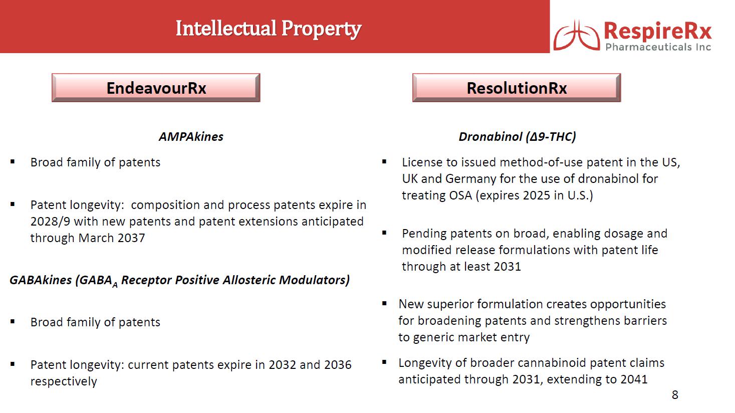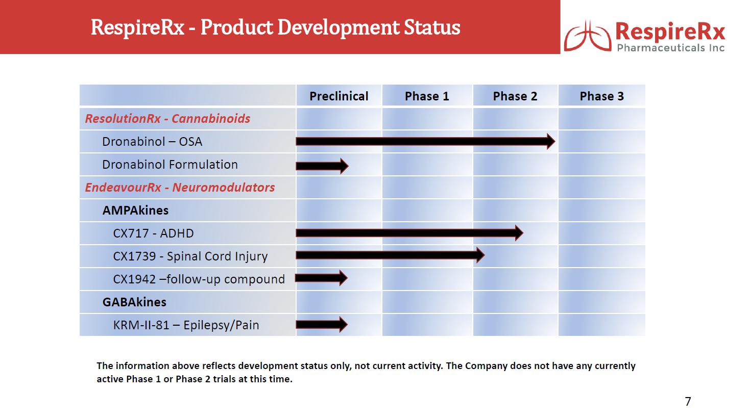 Two Phase 2 clinical trials have been completed demonstrating the ability of dronabinol to significantly reduce the symptoms of OSA and, subject to raising sufficient financing (of which no assurance can be provided) and pending the outcome of an intended meeting with the FDA, RespireRx believes that it will be able to commence a pharmacokinetic study for a recently discovered and to-be-developed formulation followed by a Phase 3 clinical study for the treatment of OSA with the new formulation. Because dronabinol is already FDA approved for the treatment of AIDS related anorexia and chemotherapy induced nausea and vomiting, the Company further believes that its re-purposing strategy would only require approval by the FDA of a 505(b)(2) new drug application (“NDA”), an efficient regulatory pathway that allows the use of publicly available data.