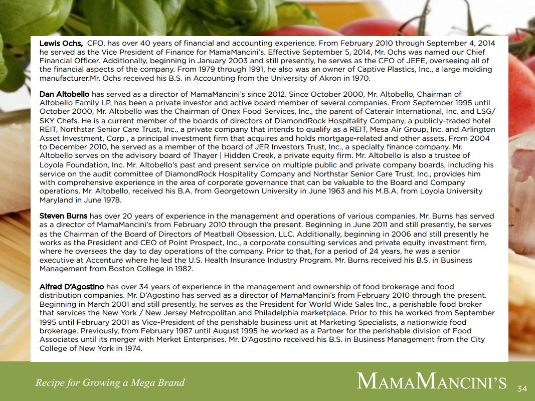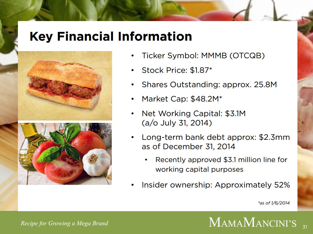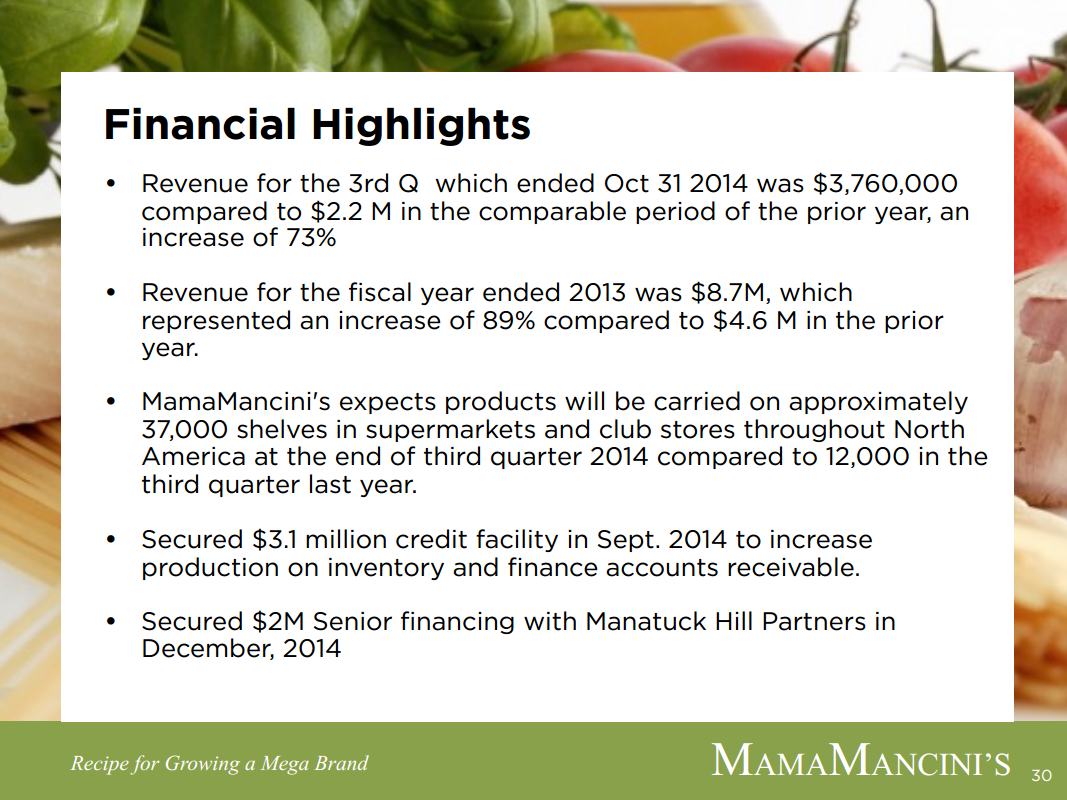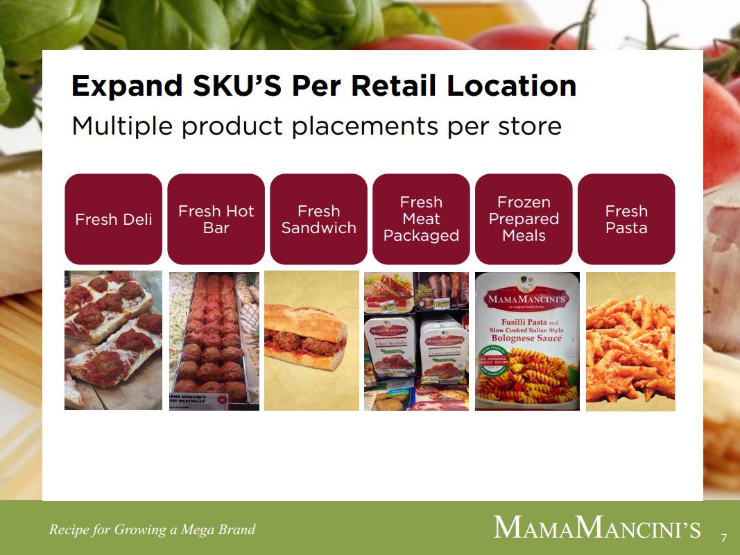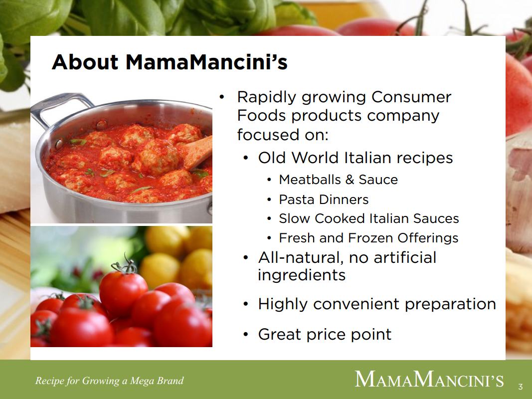 MamaMancini’s Holdings, Inc. issued an investor presentation (the “Investor Presentation”) regarding an update on its operations and future products and distribution. A copy of the Investor Presentation is attached to this current report on Form 8-K as Exhibit 99.1. In accordance with General Instruction B.2 of Form 8-K, the information set forth herein and in the Investor Presentation is deemed to be “furnished” and shall not be deemed to be “filed” for purposes of the Securities Exchange Act and shall not be incorporated by reference into any registration statement or other document filed under the Securities Act or the Securities Exchange Act, except as shall be expressly set forth by specific reference in such filing. The information set forth in Item 7.01 of this report shall not be deemed an admission as to the materiality of any information in this report on Form 8-K that is required to be disclosed solely to satisfy the requirements of Regulation FD.