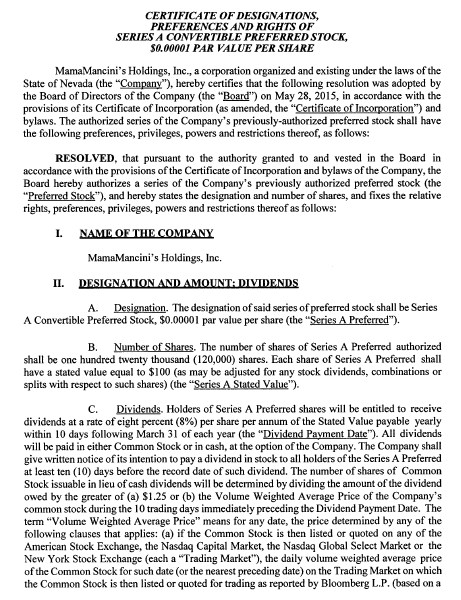 WHEREAS, each holder of Series A Preferred will be entitled to receive dividends at a rate of eight percent (8%) per share per annum of the stated value ($100 per share), payable yearly within 10 days following March 31 of each year, payable in either Common Stock (“Dividend Shares”) or in cash, at the option of the Company;