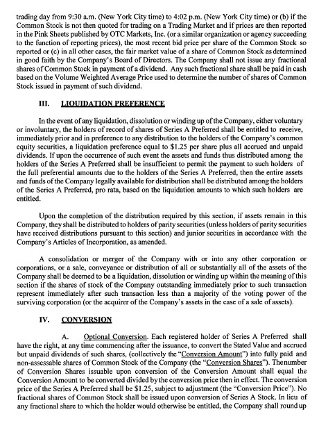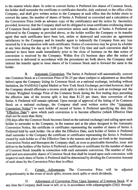 The Preferred Stock will automatically convert into Common Stock at $1.25 per share (subject to adjustment as described below) upon the Company listing its securities on a national exchange, including without limitation, the NASDAQ Capital Market or New York Stock Exchange; provided however, that if the Company should effectuate a reverse stock split in order to list on such an exchange and the volume weighted average price of the Common Stock during the five trading days preceding the effective date of the reverse split is less than $1.25 per share, then conversion of the Series A Preferred will remain optional.