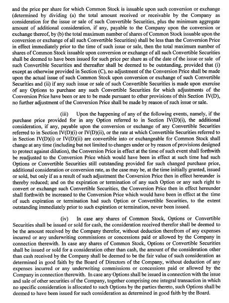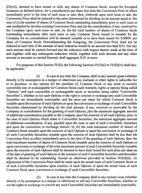 The Conversion Price will be adjusted proportionately in the event of stock splits, reverse stock splits or stock dividends. If the Company issues any shares of its Common Stock following the Offering for cash consideration per share which is less than the Conversion Price then in effect or if the Company issues options, warrants or securities convertible into shares of Common Stock having an exercise price per share or conversion price per share that is less than the Conversion Price then in effect, then the Conversion Price will be adjusted using a weighted average formula.