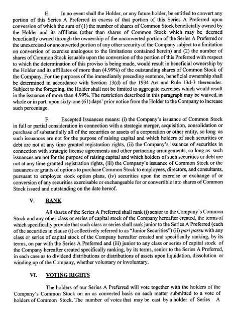 Neither we nor a holder of our Series A Preferred may convert any amount that would result in the holder having a beneficial ownership of our Common Stock which would be in excess of the sum of (i) the number of shares of Common Stock beneficially owned by the holder and its affiliates on the conversion date and (ii) the number of shares of our Common Stock issuable upon the conversion, which would result in the aggregate beneficial ownership by such holder and its affiliates of more than 4.99% of the outstanding shares of our Common Stock. The holder of our Series A Preferred may waive the conversion limitation in whole or in part upon and effective after sixty one (61) days’ prior written notice to our Company.