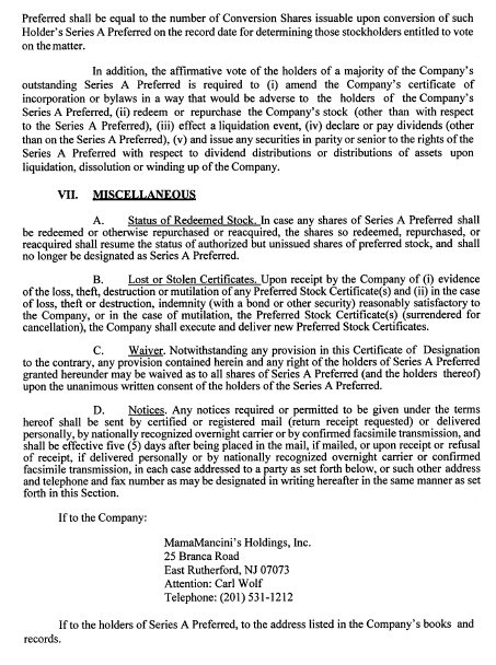12. Notices. All notices, demands, requests, consents, approvals, and other communications required or permitted hereunder shall be in writing and, unless otherwise specified herein, shall be (i) personally served, (ii) deposited in the mail, registered or certified, return receipt requested, postage prepaid, (iii) delivered by reputable air courier service with charges prepaid, or (iv) transmitted by hand delivery, telegram, or facsimile addressed as set forth below or to such other address as such party shall have specified most recently by written notice. Any notice or other communication required or permitted to be given hereunder shall be deemed effective (a) upon hand delivery or delivery by facsimile, with accurate confirmation generated by the transmitting facsimile machine, at the address or number designated below (if delivered on a business day during normal business hours where such notice is to be received), or the first business day following such delivery (if delivered other than on a business day during normal business hours where such notice is to be received), or (b) on the second business day following the date of mailing by express courier service, fully prepaid, addressed to such address, or upon actual receipt of such mailing, whichever shall first occur. The addresses for such communications shall be: (i) if to the Company, to MamaMancini’s Holdings, Inc., 25 Branca Road, East Rutherford, NJ, 07073 Attn: Carl Wolf, with a copy by fax only to (which shall not constitute notice) Lucosky Brookman LLP, 101 Wood Avenue South, 5th Floor, Iselin, NJ 08830, Attn: Joseph M. Lucosky, Esq., facsimile: (732) 395-4401, and (ii) if to the Holder, to the address and facsimile number listed on the first paragraph of this Warrant.
