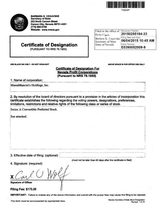 | 3.1* | Series A Convertible Preferred Certificate of Designation | |