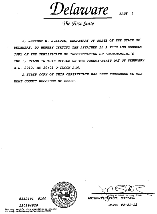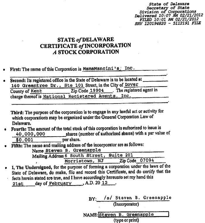 MamaMancini’s roots go back to founder Dan Dougherty, whose grandmother (“Ms. Mancini”), emigrated from Italy. Our business is founded upon her traditional recipes. The recipes have been developed and integrated into packaged foods for sale in retailers around the country. On February 22, 2010, MamaMancini’s was formed as a limited liability company under the laws of the state of New Jersey in order to commercialize our initial products. On March 5, 2012, the members of MamaMancini’s, LLC, holders of 4,700 units (the “Units”) of MamaMancini’s LLC, exchanged the Units for 15,000,000 shares of common stock and those certain options to purchase an additional 223,404 shares of MamaMancini’s (the “Exchange”). Upon consummation of the Exchange, MamaMancini’s LLC ceased to exist and all further business has been and continue to be conducted by MamaMancini’s.