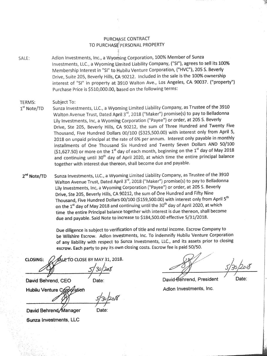 (a) On May 30, 2018, the Company entered into a purchase contract to purchase personal property (“the Sunza Agreement”) with Adlon Investments, Inc. a Wyoming Corporation (“Adlon”), to acquire its 100% membership interest in Sunza Investments, LLC, a Wyoming Limited Liability Company (“Sunza”). The Sunza Agreement was subject to due diligence and verification of title and rental income. Adlon was 100% owned by Jacaranda Investments, Inc., a Wyoming Corporation (“Jacaranda”), which is 100% owned by our Chairman and CEO. The acquisition was scheduled to close on May 31, 2018 and did close on May 31, 2018. Sunza’s sole asset was the real property located at 3910 Walton Avenue, Los Angeles, CA 90037 (the “Property”). Under the terms of the Sunza Agreement, the Company’s purchase price is $510,000 (“the Purchase Price”), which is comprised of the following: (1) a $325,000 promissory note dated April 5, 2018 (the “Note”) and a First Deed of Trust, secured by the Property, whereby Sunza, as Trustee of the 3910 Walton Avenue Trust, Dated April 3, 2018 (“Maker”) promise(s) to pay Belladonna Lily Investments, Inc, a Wyoming Corporation (“Payee”) or order, at 205 S. Beverly Drive, Ste 205, Beverly Hills, CA 90212, the sum of Three Hundred and Twenty Five Thousand, Five Hundred Dollars 00/100 ($325,000) with interest only from April 5, 2018 ,on unpaid principal at the rate of 6% per annum. Interest only payable in monthly installments of One Thousand Six Hundred and Twenty Seven Dollars and 50/100 ($1,627.50), or more, on the 1st day of each month, beginning on the May 1, 2018 and continuing until April 30, 2020, at which time the entire principal balance together with interest due thereon, shall become due and payable; and (2) a $159,500 promissory note dated April 3, 2018 (the “2nd Note”) secured by a 2nd Trust Deed and payable to Belladonna Lily Investments, Inc, a Wyoming Corporation (“Payee”) or order, at 205 S. Beverly Drive, Ste 205, Beverly Hills, CA 90212, with interest only from April 5, 2018 on May 1, 2018 and continuing until the April 30, 2020, at which time the entire Principal balance together with interest is due thereon, shall become due and payable. The 2 nd Note increased to $184,500.00 on May 31, 2018. Adlon agreed to indemnify the Company of any liability with respect to Sunza and its assets prior to closing escrow. Each party paid its own closing costs and one-half of the escrow fee.