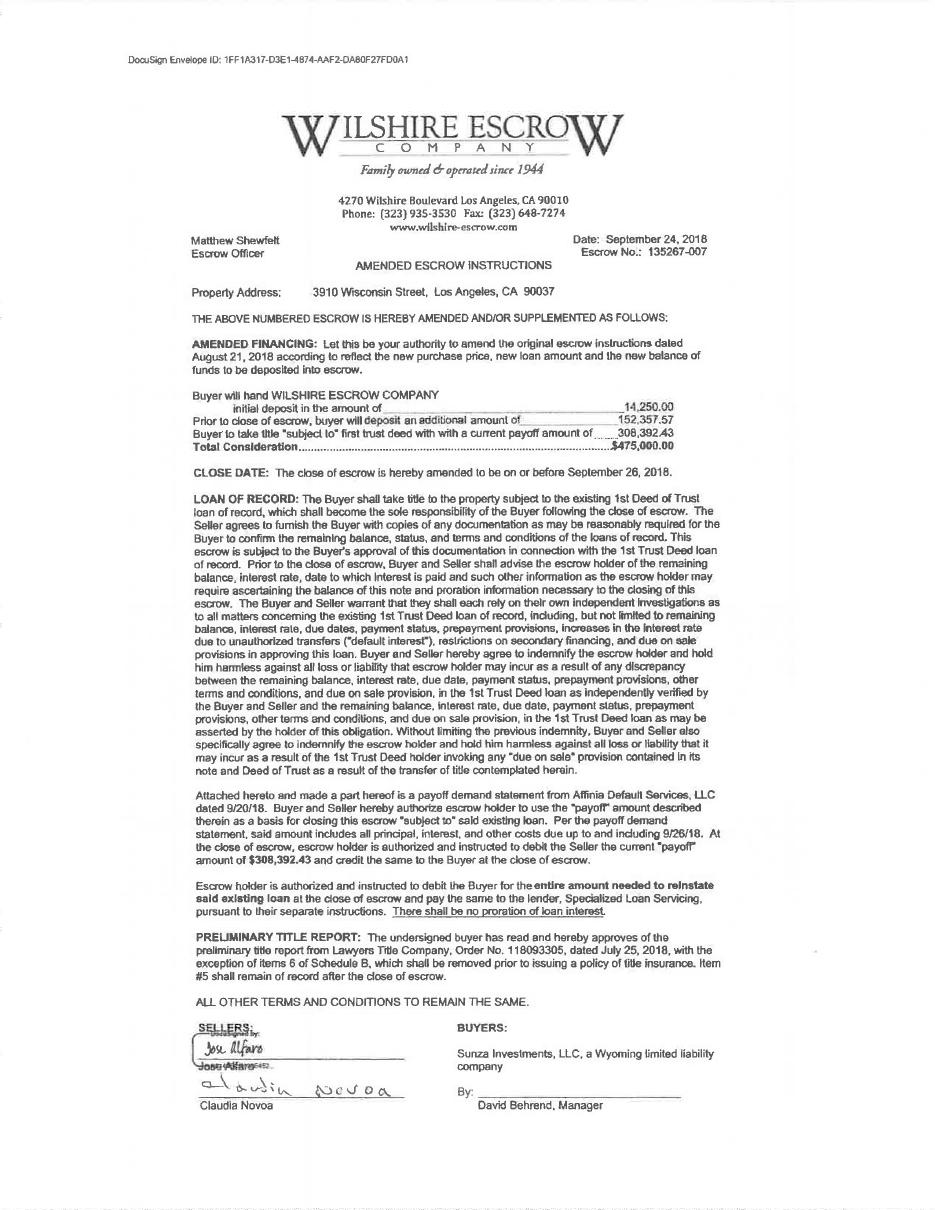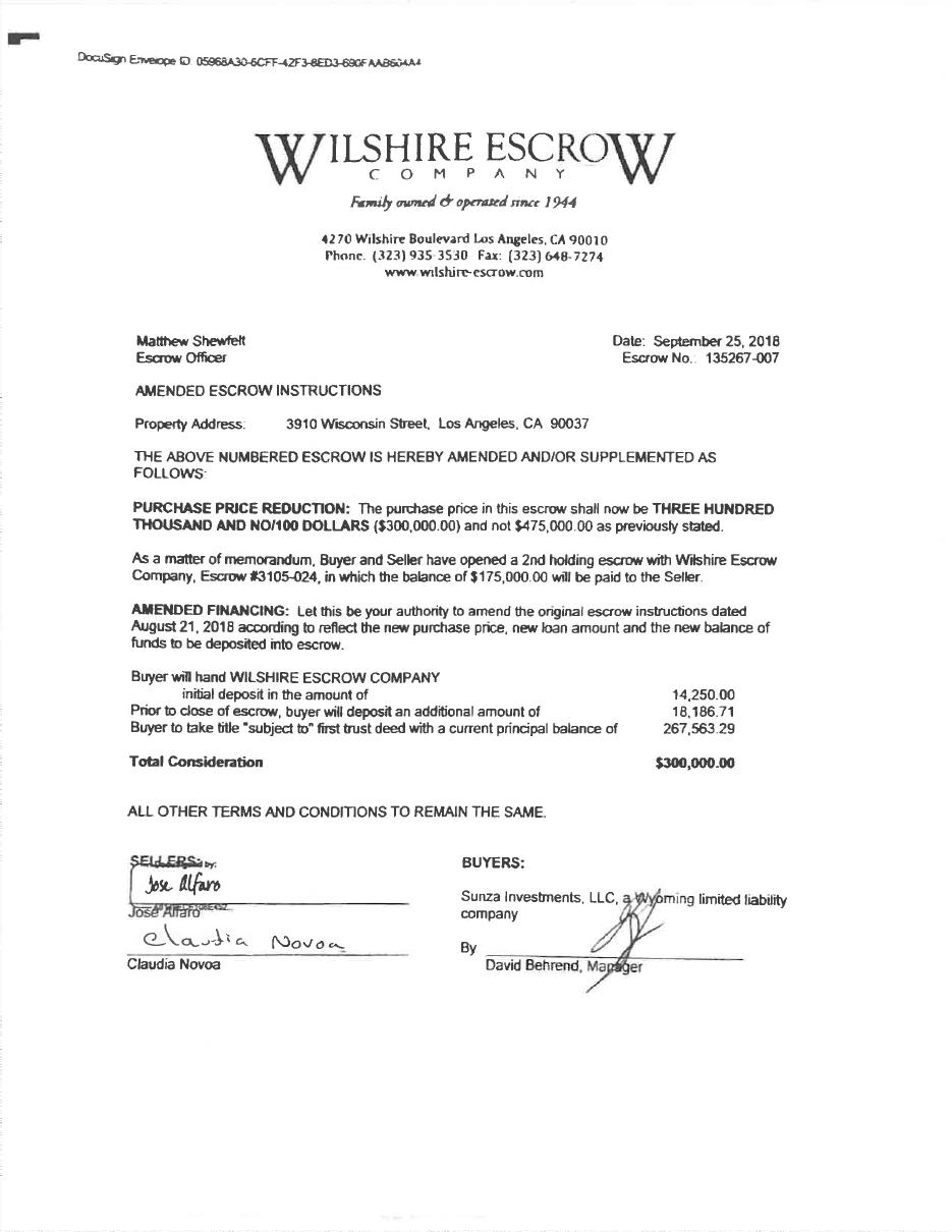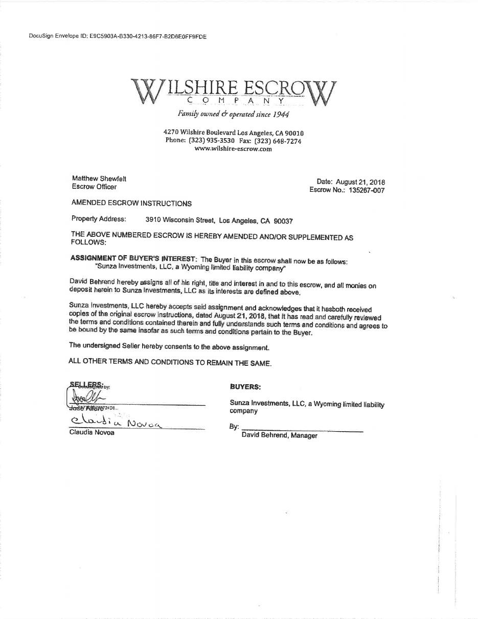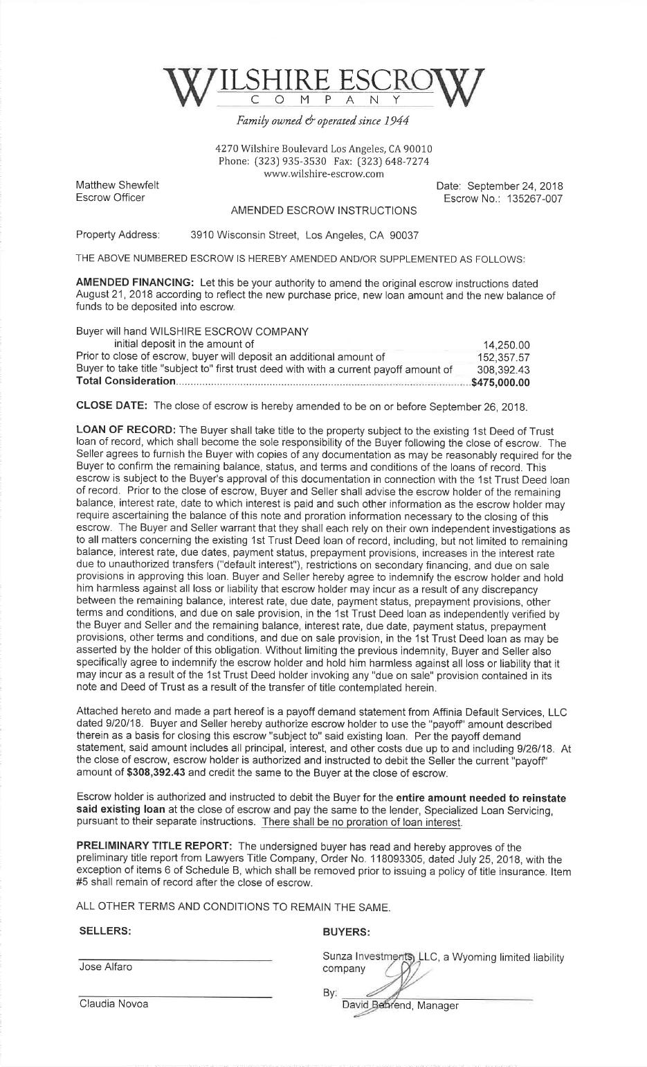 (b) On August 21, 2018, the Company, through its wholly-owned subsidiary, Sunza, entered into an agreement and escrow (the “Wisconsin Agreement”) with Jose Alfaro and Claudia Novoa (the “Property Sellers”) to acquire the real property located at 3910 Wisconsin, Los Angeles CA (the “Wisconsin Property”) for a purchase price of $487,500 (the “Purchase Price”). The acquisition contemplated by the Wisconsin Agreement was scheduled to close on September 27, 2018. The terms of the acquisition was subject to three loans: (1) A first position note (the “1 st Note”) with unpaid principal balance of $252,867.91 taken “subject to” the Property Sellers owing their lender, whose terms of payments are principal and interest, with the next payment payable from November 1, 2018, on unpaid principal at the rate of 4.375% per annum. Interest only payable in monthly installments of $1,627.50 or more on the 1 st day of each month beginning on the November 1, 2018, and continuing until October 1, 2036, at which time the entire principal balance together with interest due thereon, shall become due and payable. The 1 st Note was already in effect since June 13, 2006; (2) a $200,000 second position note owing by Sunza to Yerba Mate Corporation, whose terms of payments due were interest only, payable from November 1, 2018 on unpaid principal at the rate of 9% per annum. Interest only payable in monthly installments of $1,500.00 or more on the 1st day of each month beginning on the November 1, 2018, and continuing until October 31, 2020, at which time the entire principal balance together with any outstanding interest due thereon, shall become due and payable; and (3) “Subject To” a $40,000 third position note owing by Sunza to Belladonna Lily Investments, Inc. (“Bella”), whose terms of payments due were interest only, payable from November 1, 2018 on unpaid principal at the rate of 9% per annum. Interest only payable in monthly installments of $300.00 or more on the 1st day of each month beginning on November 1, 2018 and continuing until April 30, 2022, at which time the entire principal balance together with any outstanding interest due thereon, shall become due and payable.
