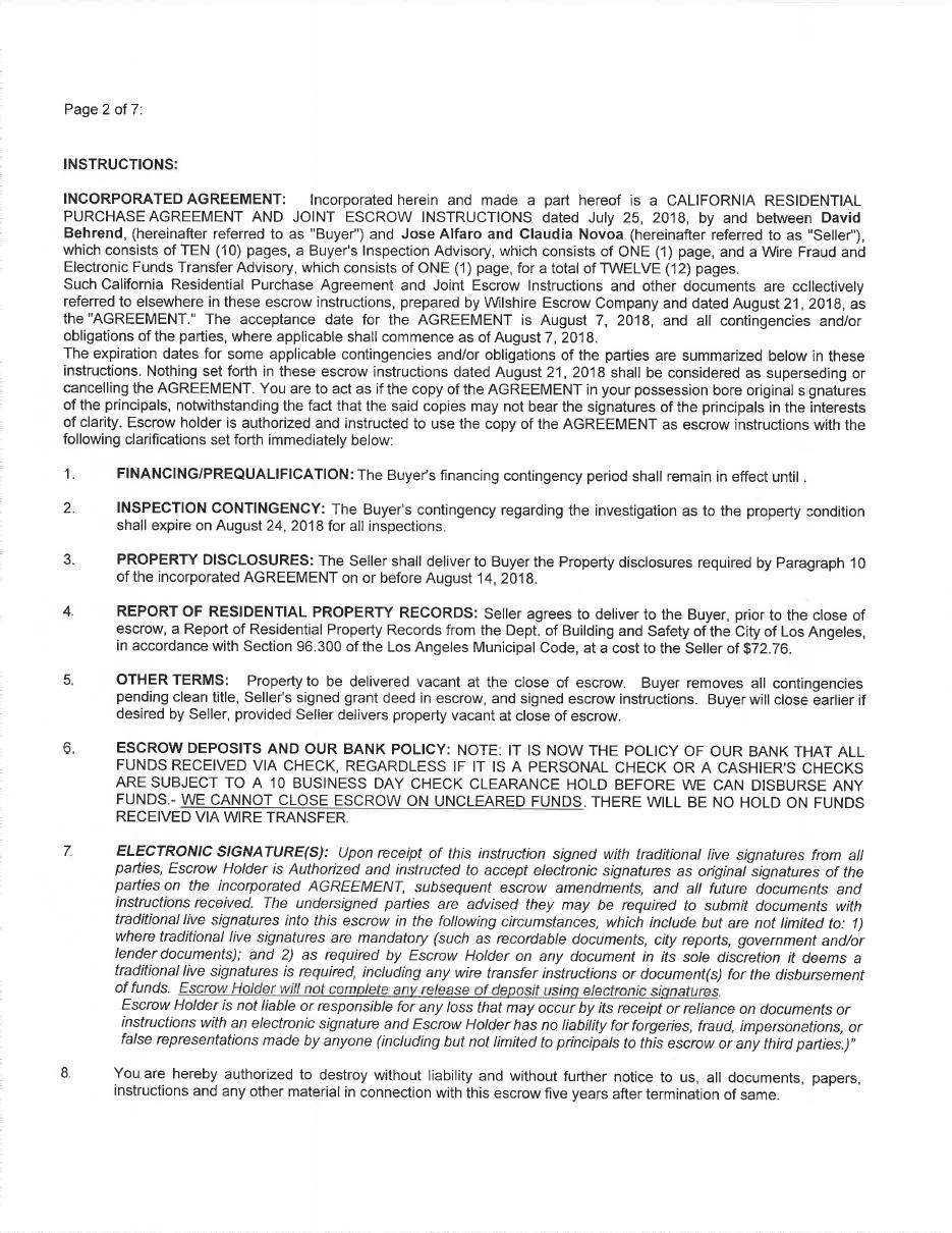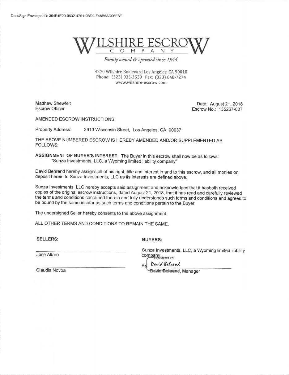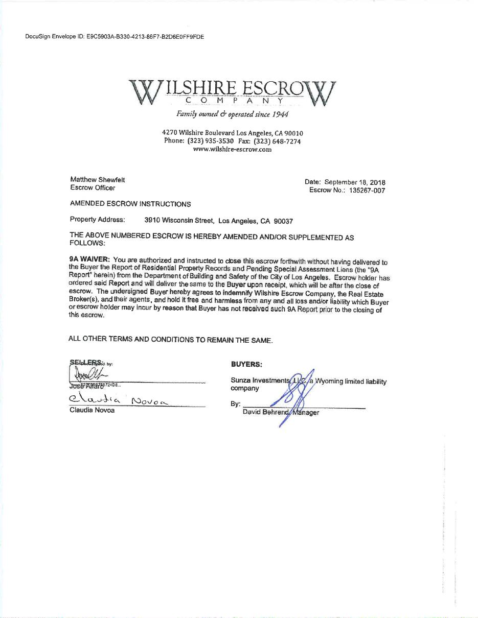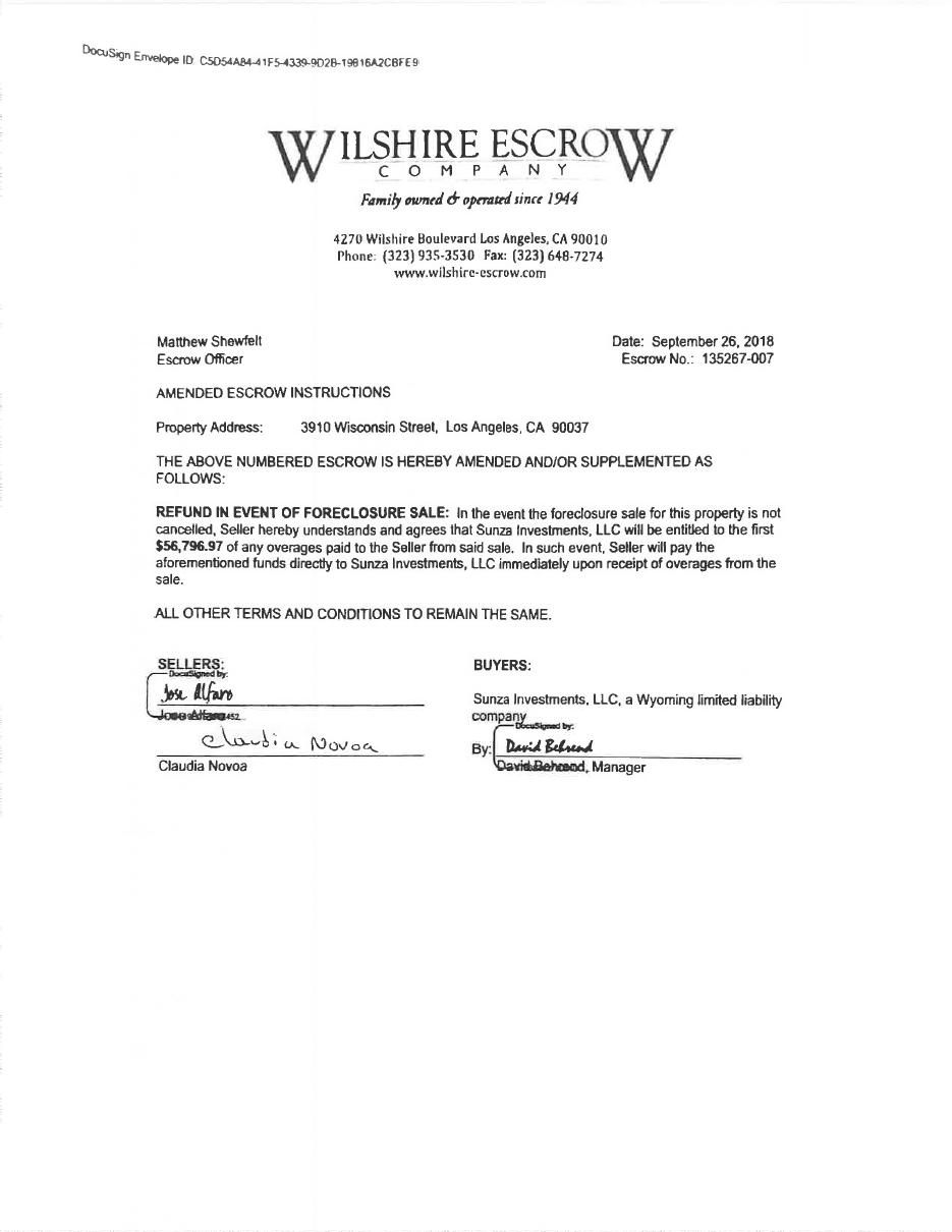(b) On August 21, 2018, the Company, through its wholly-owned subsidiary, Sunza, entered into an agreement and escrow (the “Wisconsin Agreement”) with Jose Alfaro and Claudia Novoa (the “Property Sellers”) to acquire the real property located at 3910 Wisconsin, Los Angeles CA (the “Wisconsin Property”) for a purchase price of $487,500 (the “Purchase Price”). The acquisition contemplated by the Wisconsin Agreement was scheduled to close on September 27, 2018. The terms of the acquisition was subject to three loans: (1) A first position note (the “1 st Note”) with unpaid principal balance of $252,867.91 taken “subject to” the Property Sellers owing their lender, whose terms of payments are principal and interest, with the next payment payable from November 1, 2018, on unpaid principal at the rate of 4.375% per annum. Interest only payable in monthly installments of $1,627.50 or more on the 1 st day of each month beginning on the November 1, 2018, and continuing until October 1, 2036, at which time the entire principal balance together with interest due thereon, shall become due and payable. The 1 st Note was already in effect since June 13, 2006; (2) a $200,000 second position note owing by Sunza to Yerba Mate Corporation, whose terms of payments due were interest only, payable from November 1, 2018 on unpaid principal at the rate of 9% per annum. Interest only payable in monthly installments of $1,500.00 or more on the 1st day of each month beginning on the November 1, 2018, and continuing until October 31, 2020, at which time the entire principal balance together with any outstanding interest due thereon, shall become due and payable; and (3) “Subject To” a $40,000 third position note owing by Sunza to Belladonna Lily Investments, Inc. (“Bella”), whose terms of payments due were interest only, payable from November 1, 2018 on unpaid principal at the rate of 9% per annum. Interest only payable in monthly installments of $300.00 or more on the 1st day of each month beginning on November 1, 2018 and continuing until April 30, 2022, at which time the entire principal balance together with any outstanding interest due thereon, shall become due and payable.
