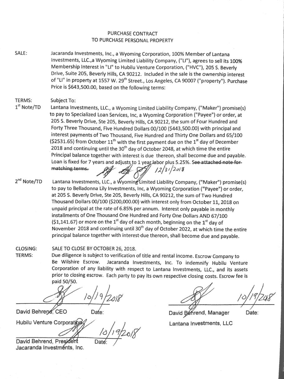 (c) On October 19, 2018, the Company entered into a purchase contract to purchase personal property (“the Lantana Agreement”) with Jacaranda to acquire 100% membership interest in Lantana Investments, LLC, a Wyoming Limited Liability Company (“Lantana”). Jacaranda is 100% owned by our Chairman and CEO. The acquisition was scheduled to close on October 26, 2018. Lantana’s sole asset was the real property located at 1557 W. 29 th Street, Los Angeles CA (“the Property”). Under the terms of the Lantana Agreement, the Company was to acquire 100% membership interest in Lantana for $643,500 (“the Purchase Price”) payable as follows: (1) a $443,500 promissory note (the “Lantana Note”) with principal and interest payments of $2,531.65 from October 11, 2018 with the first payment due on the December 1, 2018 and continuing until the October 30, 2048, at which time the entire principal balance together with interest is due thereon and is secured by a 1 st Trust Deed. The Lantana Note is fixed for 7 years and thereafter adjust to 1 year labor plus 5.25%; and (2) a $200,000 promissory note (the “Lantana Second Note”) secured by a 2 nd Trust Deed and owing by Belladonna Lily Investments, Inc, a Wyoming Corporation (“Payee”) or order with interest only from October 11, 2018 on unpaid principal at the rate of 6.85% per annum. Interest only payable in monthly installments of $1,141.67 or more on the 1 st day of each month, beginning on the November 1, 2018 and continuing until October 30, 2022, at which time the entire principal balance together with interest due thereon, shall become due and payable.