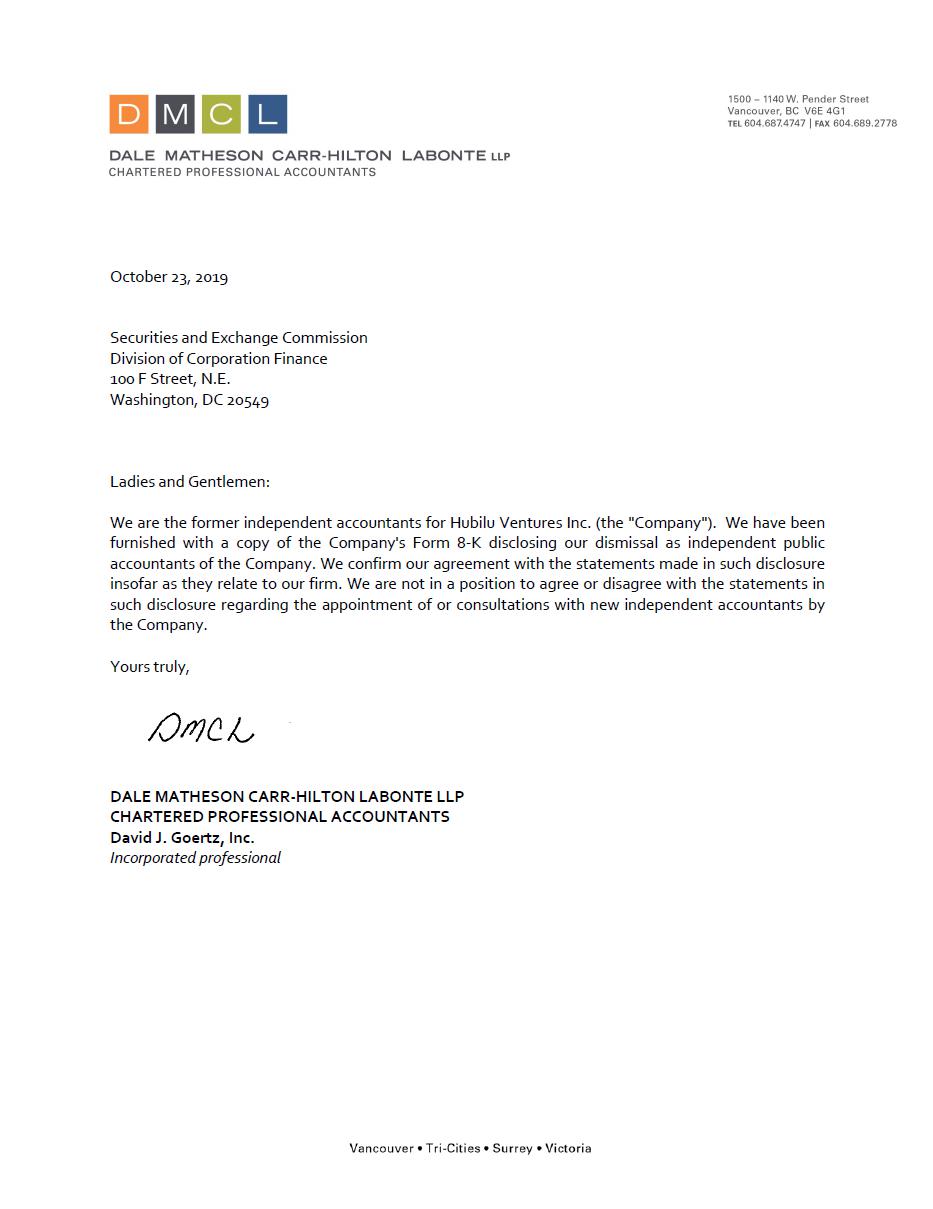 16.1 Letter from Dale Matteson Carr-Hilton LaBonte LLP, to the Securities and Exchange Commission.