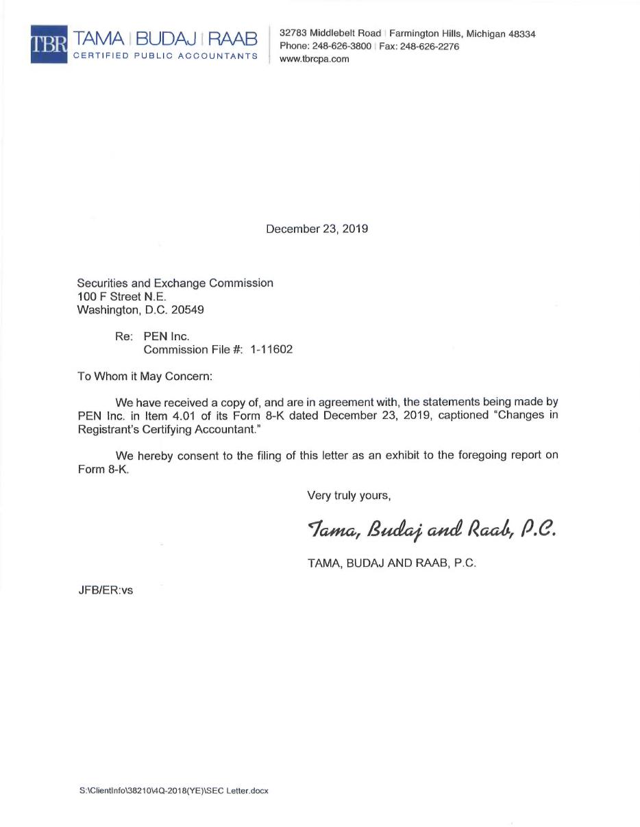 Please accept my resignation as a member of PEN Inc.’s Board of Directors, effective December 20, 2019. This was a hard decision as I am proud of the work we have done together, first with NanoFilm and then with PEN.